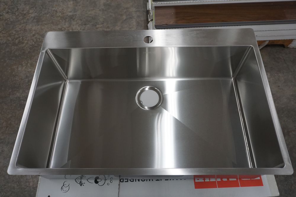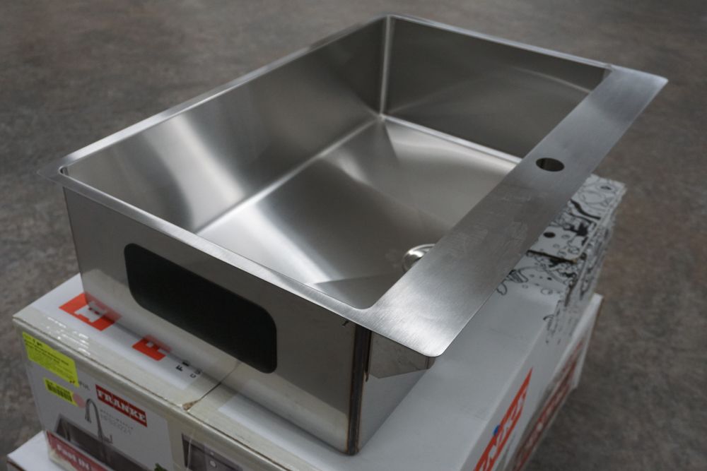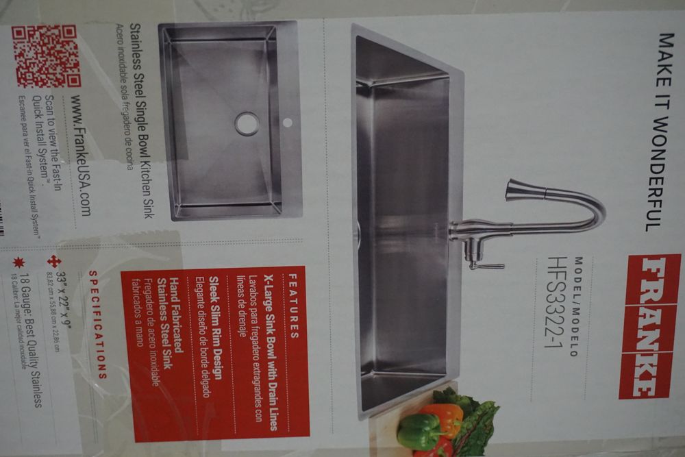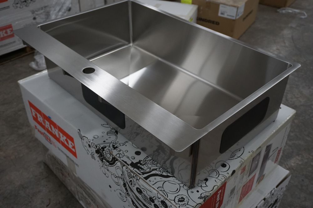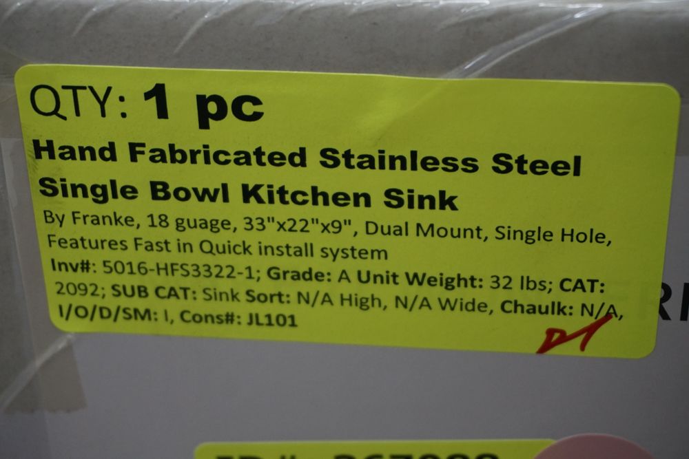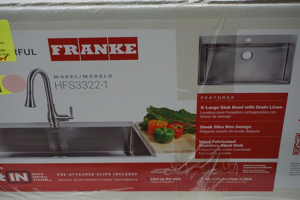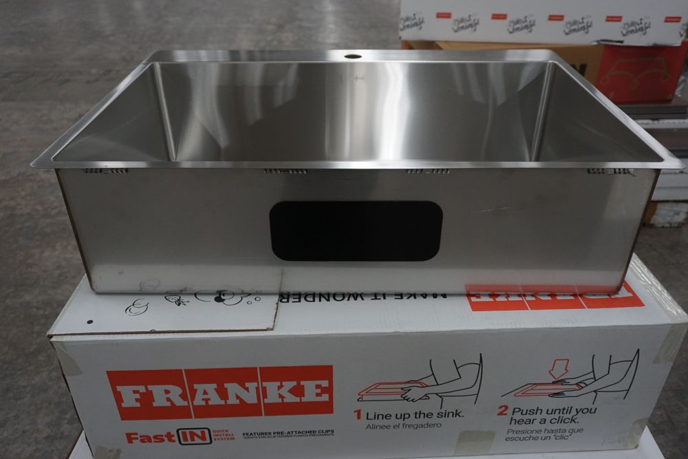 Hand Fabricated Stainless Steel Single Bowl Kitchen Sink 33"x22"x9". By Franke, 18 Gauge, 33"x22"x9", Dual Mount, Single Hole, Features Fast In, Quick Install System, Grade: A,This is a liquidated product. Any pre-existing retail, wholesale or manufacturer warranties will not transfer with the sale of this Product unless expressly stated otherwise. Weight: 32lbs. Sold by: Piece. Sold as: Quantity X Price. Inventory #: 5016-HFS3322-1