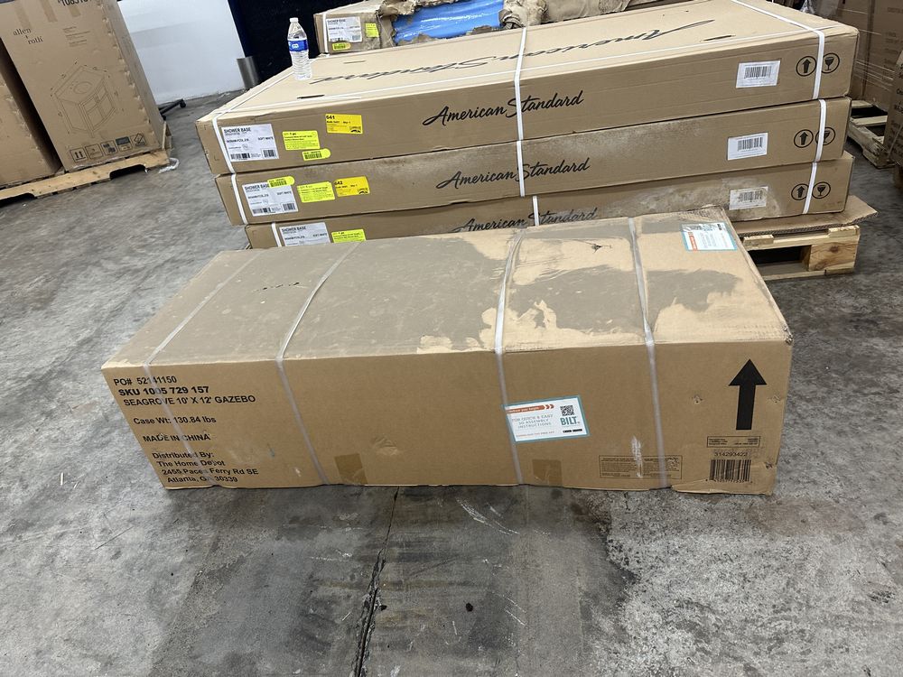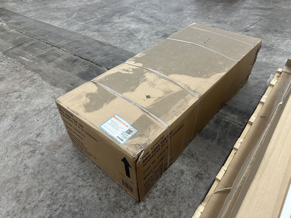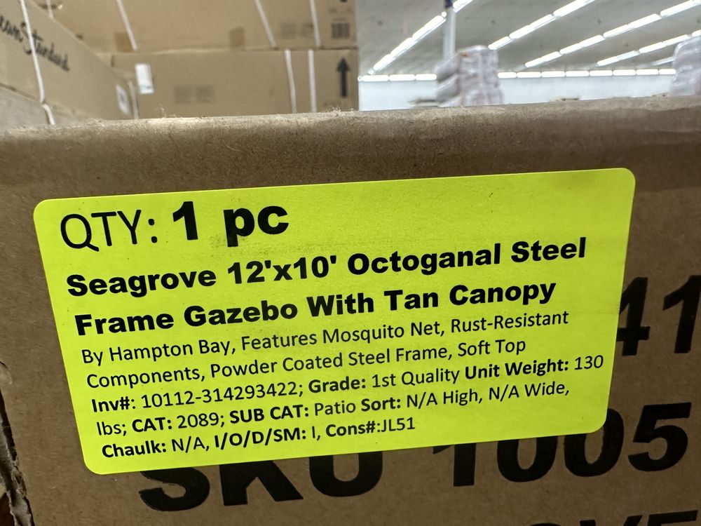 Seagrove 12'x10' Octagonal Steel Frame Gazebo With Tan Canopy. By Hampton Bay, Features Mosquito Net, Rust-Resistant Components, Powder Coated Steel Frame, Soft Top Grade: 1st,This is a liquidated product. Any pre-existing retail, wholesale or manufacturer warranties will not transfer with the sale of this Product unless expressly stated otherwise. Weight: 130. Sold by: Piece. Sold as: Quantity X Price. Inventory #: 10112-314293422
