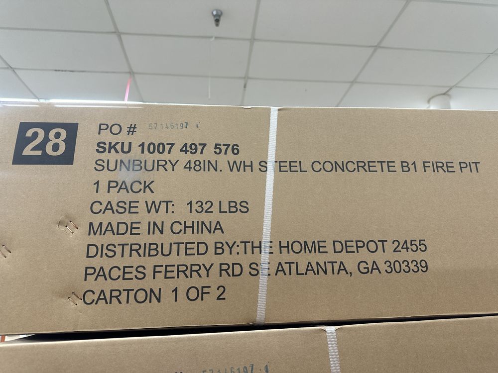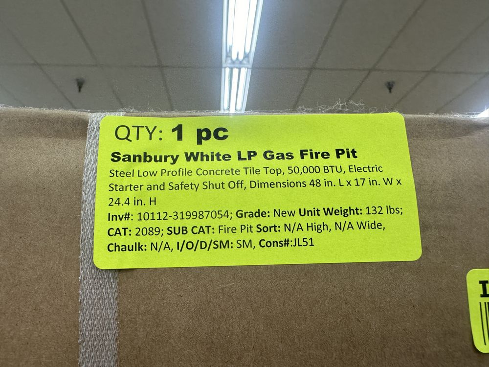 Sunbury White LP Gas Fire Pit. Steel Low Profile Concrete Tile Top, 50,000 BTU, Electric Starter and Safety Shut Off, Dimensions 48 in. L x 17 In. W x 24.4 In. H Grade: New,This is a liquidated product. Any pre-existing retail, wholesale or manufacturer warranties will not transfer with the sale of this Product unless expressly stated otherwise. Weight: 132. Sold by: Piece. Sold as: Quantity X Price. Inventory #: 10112-319987054