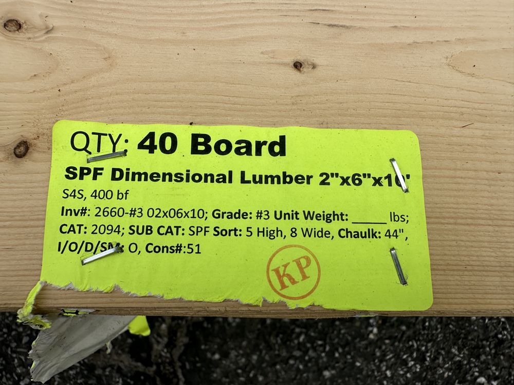 SPF Dimensional Lumber 2"x6"x10'. S4S, 400 Board Foot Grade: #3,This is a liquidated product. The Auction Company makes no express or implied representations or warranties of any kind regarding the Product. Any pre-existing retail, wholesale or manufacturer warranties will not transfer with the sale of this Product unless expressly stated otherwise on this page. The Buyer accepts the Product in as-is condition, with all faults. Weight: x. Sold by: Board. Sold as: Quantity X Price. Inventory #: 2660-#3 02x06x10
