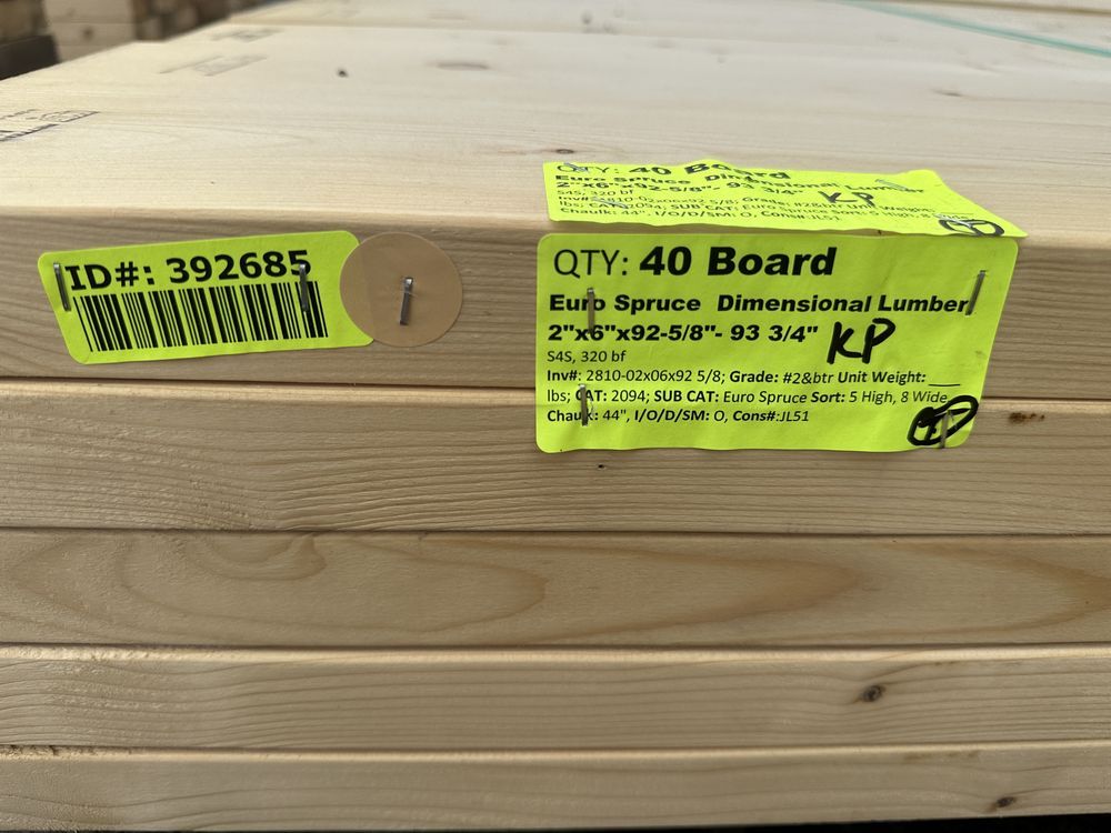 Euro Spruce Dimensional Lumber 2"x6"x92-5/8"-93 3/4". S4S, 320 Board Foot Grade: #2&btr,This is a liquidated product. The Auction Company makes no express or implied representations or warranties of any kind regarding the Product. Any pre-existing retail, wholesale or manufacturer warranties will not transfer with the sale of this Product unless expressly stated otherwise on this page. The Buyer accepts the Product in as-is condition, with all faults. Weight: x. Sold by: Board. Sold as: Quantity X Price. Inventory #: 2810-02x06x92 5/8