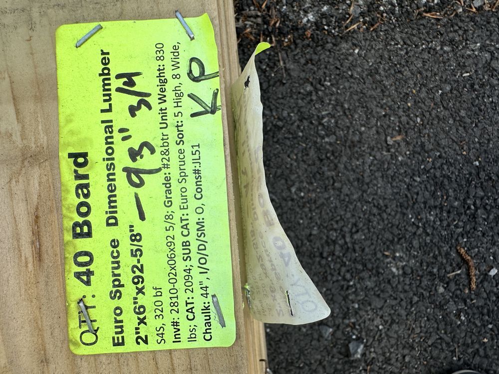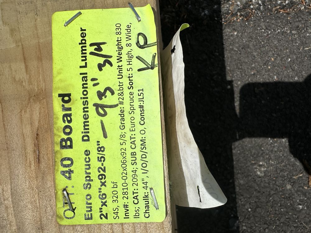 Euro Spruce Dimensional Lumber 2"x6"x93 3/4" *SEE DESCRIPTION*. S4S, 320 bf, Grade: #2&BTR. *Boards with Fork Damage, please see photos.*,This is a liquidated product. The Auction Company makes no express or implied representations or warranties of any kind regarding the Product. Any pre-existing retail, wholesale or manufacturer warranties will not transfer with the sale of this Product unless expressly stated otherwise on this page. The Buyer accepts the Product in as-is condition, with all faults. Weight: 830lbs. Sold by: Board. Sold as: Quantity X Price. Inventory #: 2810-02x06x92 5/8
