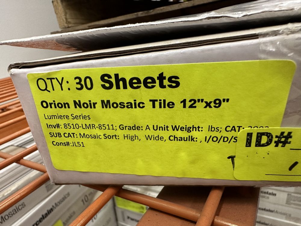 Orion Noir Mosaic Tile 12"x9". Lumiere Series 5 Sheets per Box 6 Boxes Grade A,This is a liquidated product. Any pre-existing retail, wholesale or manufacturer warranties will not transfer with the sale of this Product unless expressly stated otherwise. Weight: X. Sold by: Sheets. Sold as: Quantity X Price. Inventory #: 8510-LMR-8511