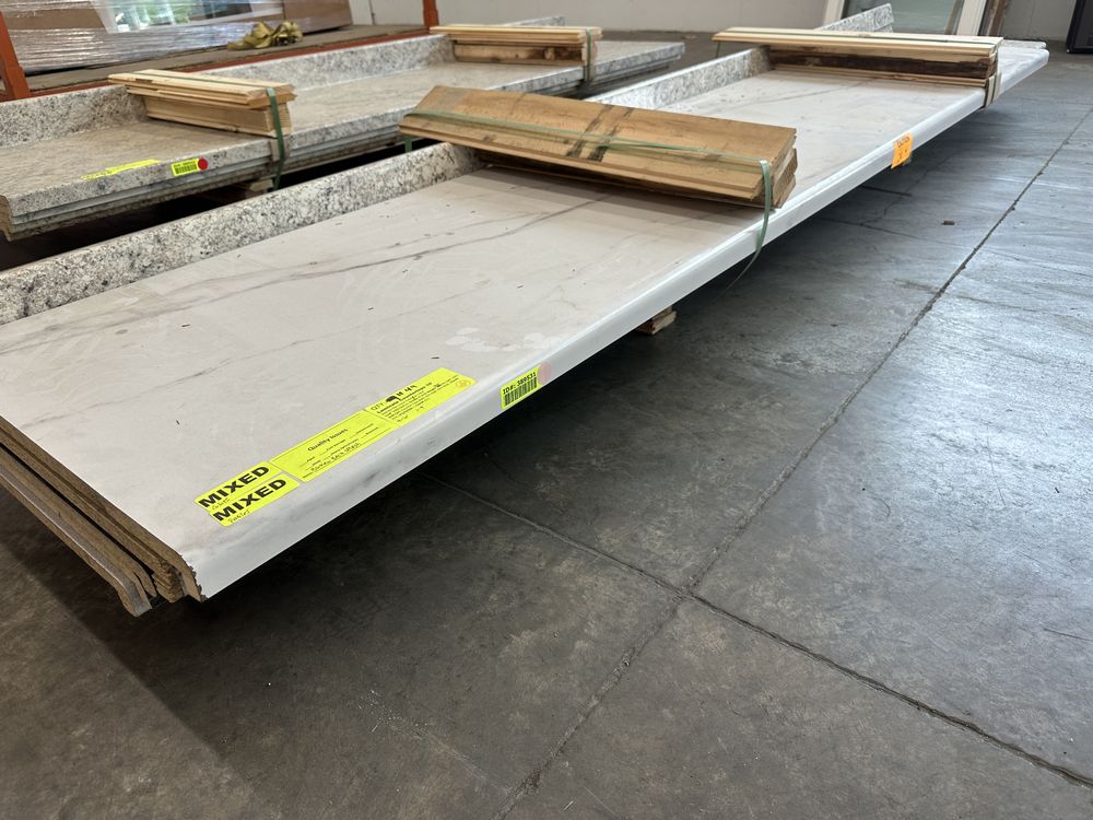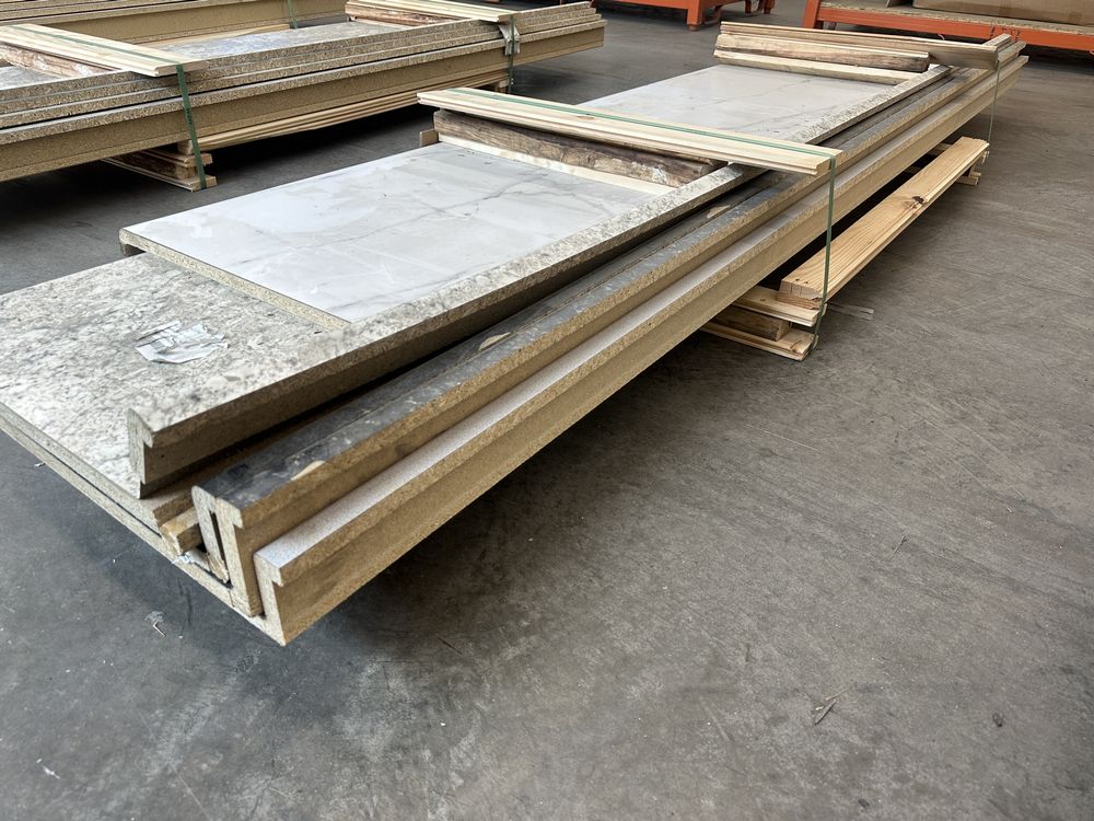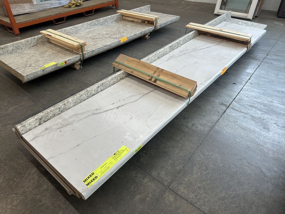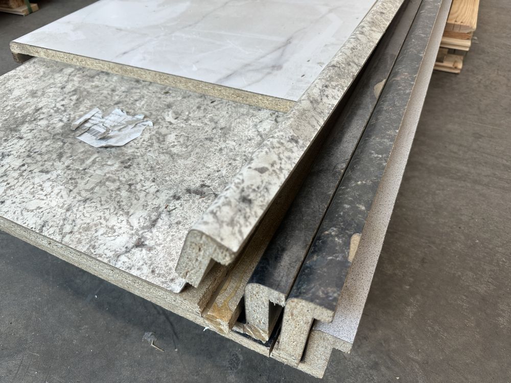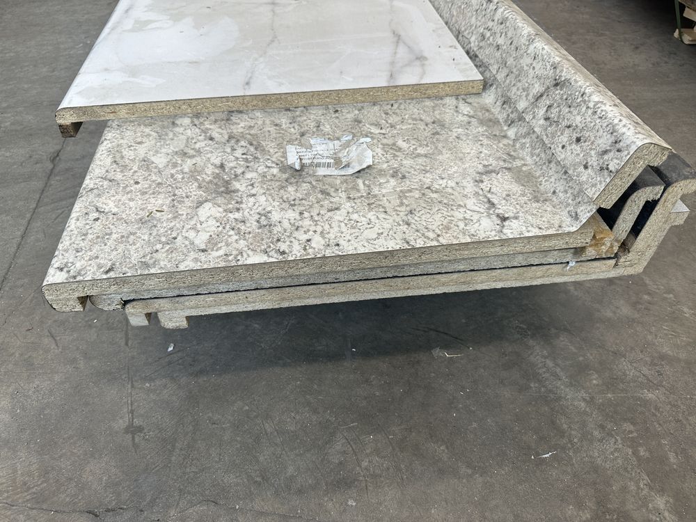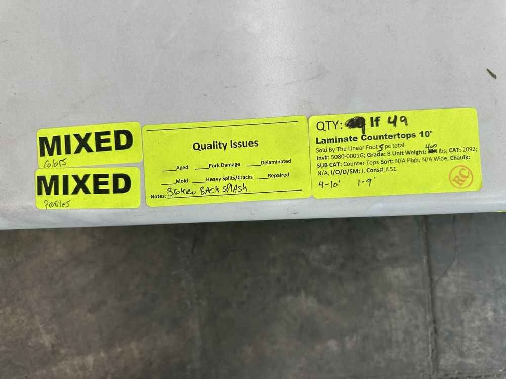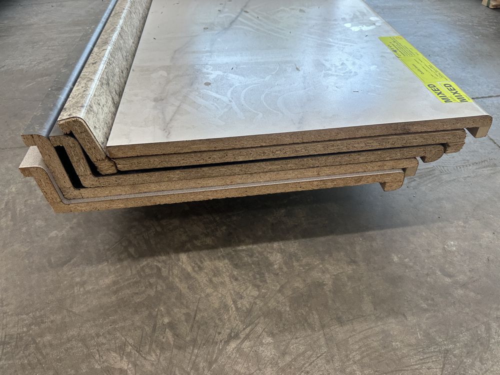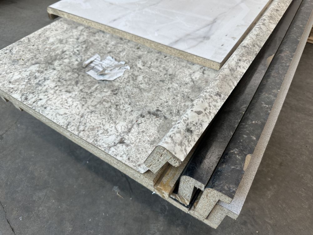 Laminate Countertops 10' and 9'. Sold by the Linear Foot, Mixed Colors and Profiles, Four 10' Countertops, One 9' Countertops, 4 pieces total, Grade: B.,This is a liquidated product. Any pre-existing retail, wholesale or manufacturer warranties will not transfer with the sale of this Product unless expressly stated otherwise. Weight: 400. Sold by: Linear Foot. Sold as: Quantity X Price. Inventory #: 5080-0001G
