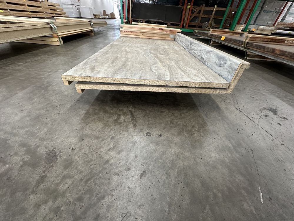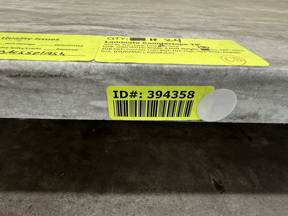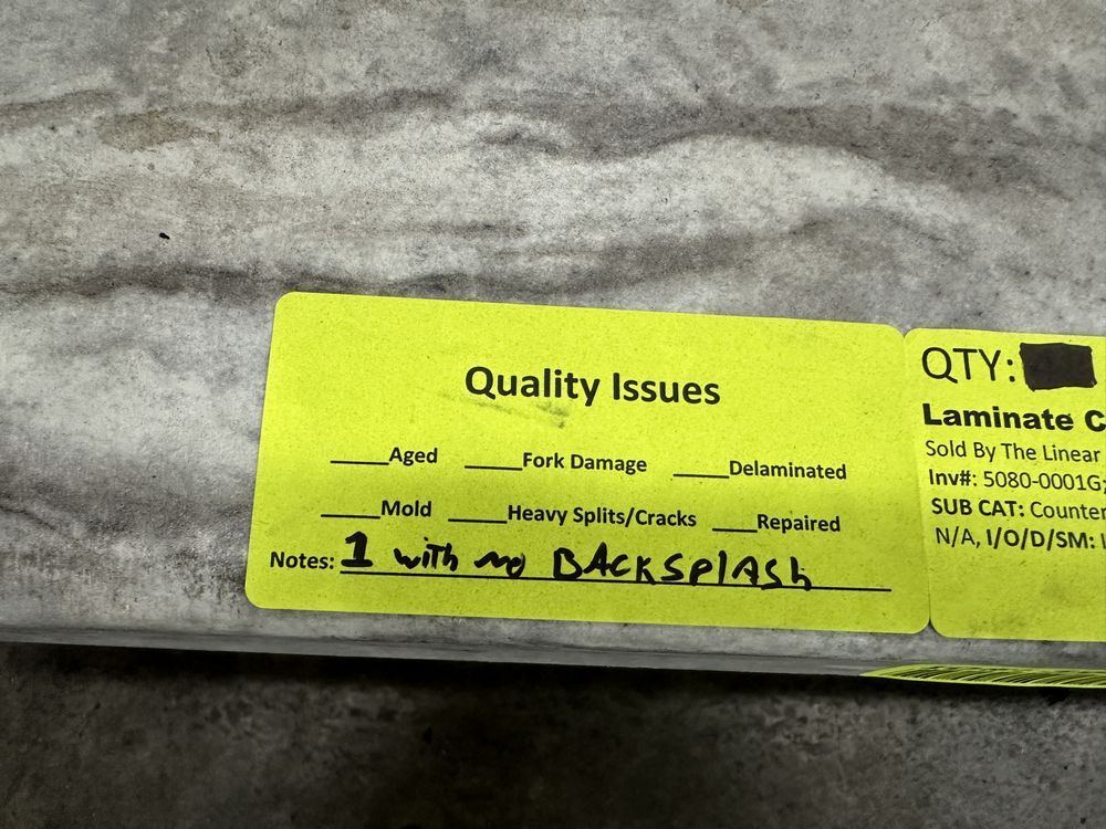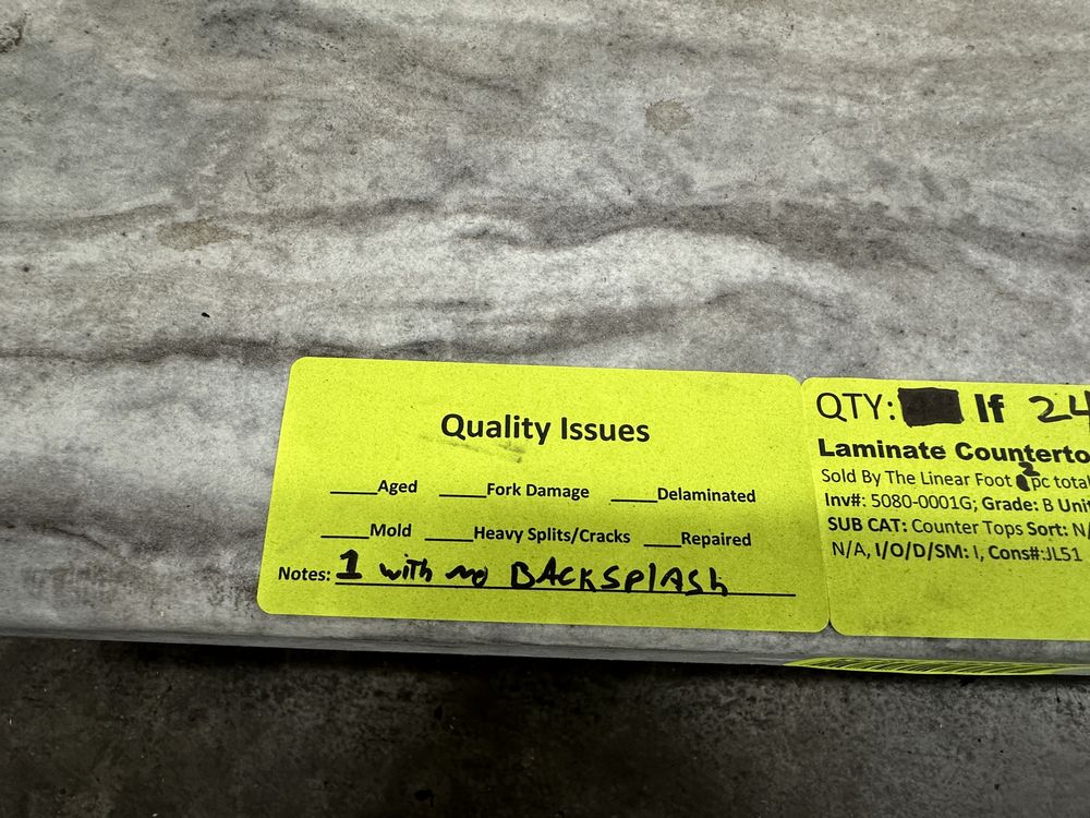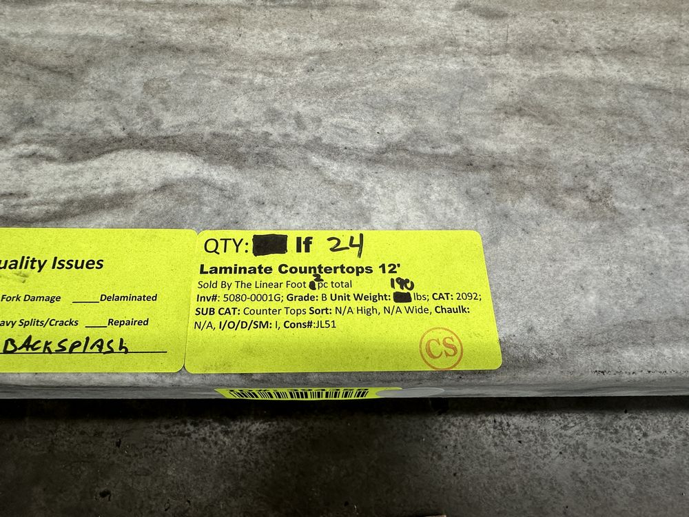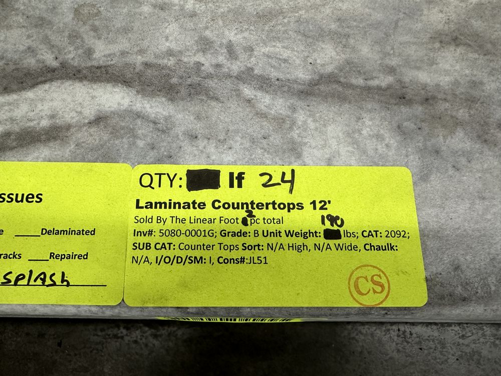Laminate Countertops 12' **SEE DESCRIPTION**. Sold By the Linear Foot, 2 Pieces Total Grade: B **1 With no Backsplash**,This is a liquidated product. Any pre-existing retail, wholesale or manufacturer warranties will not transfer with the sale of this Product unless expressly stated otherwise. Weight: 190. Sold by: Linear Foot. Sold as: Quantity X Price. Inventory #: 5080-0001G