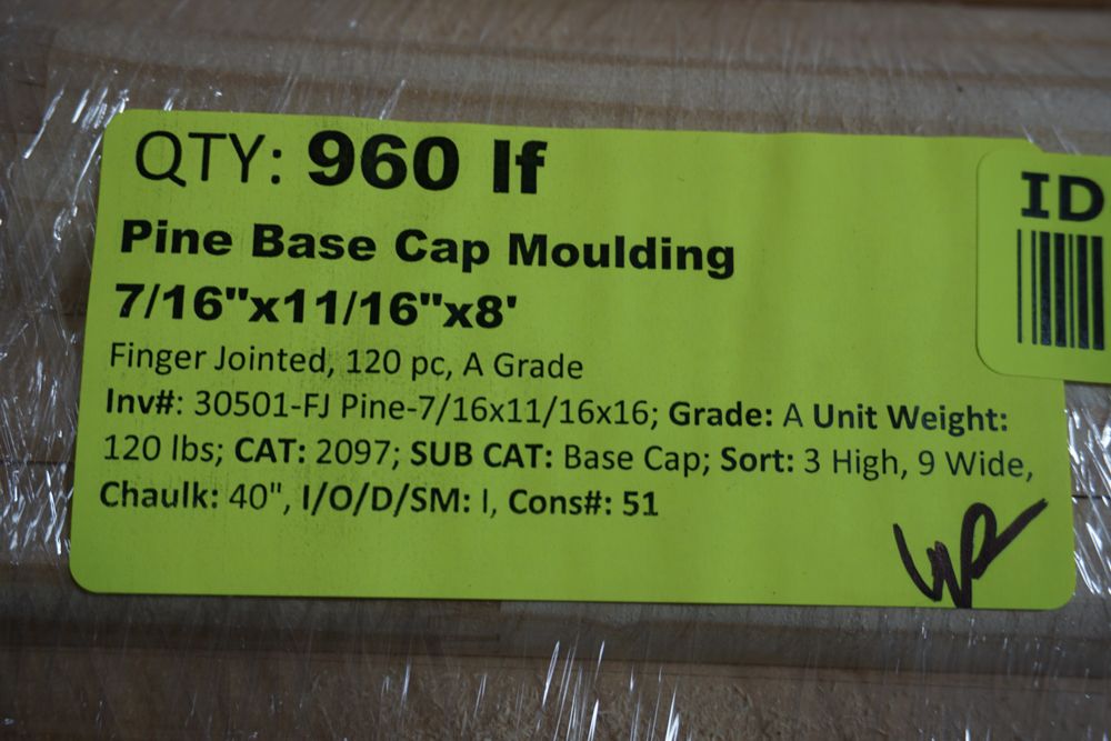Pine Base Cap Moulding 7/16"x11/16"x8'. Finger Jointed, 120 pieces, Grade: A. This is a liquidated product. The Auction Company makes no express or implied representations or warranties of any kind regarding the Product. Any pre-existing retail, wholesale or manufacturer warranties will not transfer with the sale of this Product unless expressly stated otherwise on this page. The Buyer accepts the Product in as-is condition, with all faults. Weight: 120lbs.. Sold by: Linear Foot. Sold as: Quantity X Price. Inventory #: 30501-FJ Pine-7/16x11/16x16