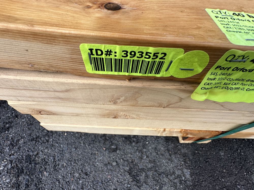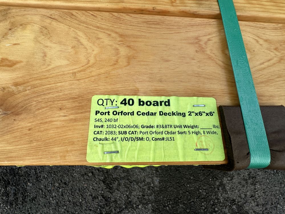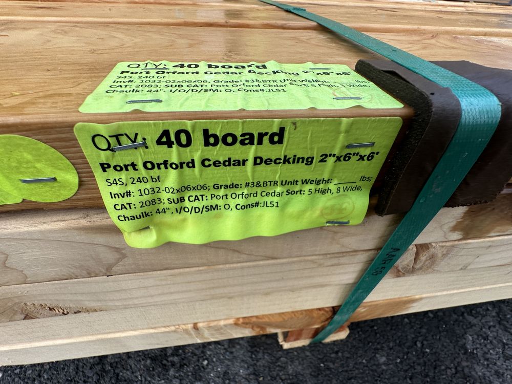 Port Orford Cedar Decking 2"x6"x6'. S4S, 240 Board Foot Grade: #3&BTR,This is a liquidated product. The Auction Company makes no express or implied representations or warranties of any kind regarding the Product. Any pre-existing retail, wholesale or manufacturer warranties will not transfer with the sale of this Product unless expressly stated otherwise on this page. The Buyer accepts the Product in as-is condition, with all faults. Weight: x. Sold by: Board. Sold as: Quantity X Price. Inventory #: 1032-02x06x06