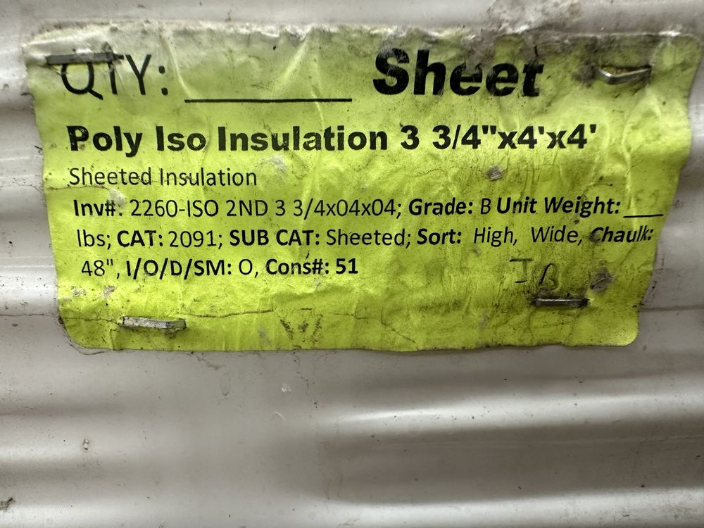 Poly Iso Insulation 3 3/4"x4'x4'. Sheeted Insulation, Grade: B,This is a liquidated product. The Auction Company makes no express or implied representations or warranties of any kind regarding the Product. Any pre-existing retail, wholesale or manufacturer warranties will not transfer with the sale of this Product unless expressly stated otherwise on this page. The Buyer accepts the Product in as-is condition, with all faults. Weight: 180. Sold by: Sheet. Sold as: Quantity X Price. Inventory #: 2260-ISO 2ND 3 3/4x04x04