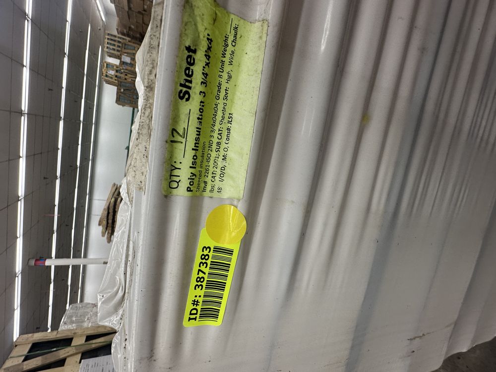 Poly Iso Insulation, 3 3/4"x4'x4'. Sheeted Insulation, Grade: B,This is a liquidated product. The Auction Company makes no express or implied representations or warranties of any kind regarding the Product. Any pre-existing retail, wholesale or manufacturer warranties will not transfer with the sale of this Product unless expressly stated otherwise on this page. The Buyer accepts the Product in as-is condition, with all faults. Weight: X. Sold by: Sheet. Sold as: Quantity X Price. Inventory #: 2261-ISO 2ND 3 3/4X04X04