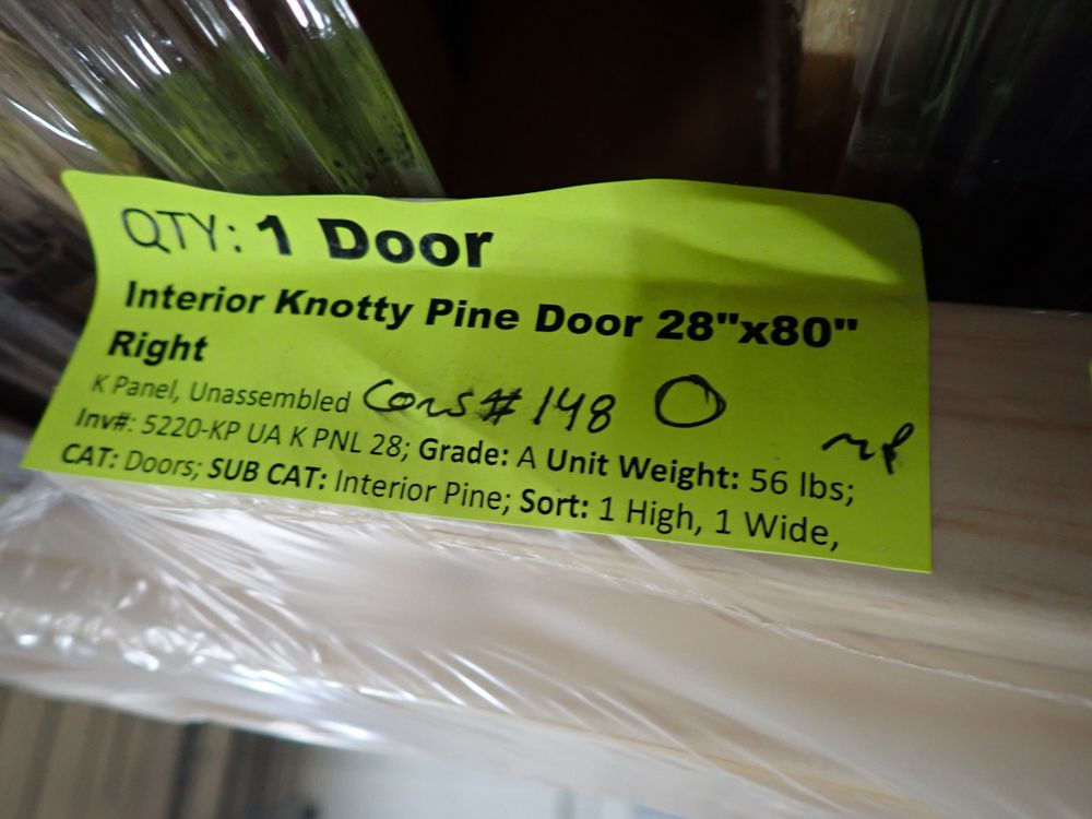 Interior Knotty Pine Barn Door 28"x80" K PNL RH (Unassembled). Grade: A. This is a liquidated product. The Auction Company makes no express or implied representations or warranties of any kind regarding the Product. Any pre-existing retail, wholesale or manufacturer warranties will not transfer with the sale of this Product unless expressly stated otherwise on this page. The Buyer accepts the Product in as-is condition, with all faults. Weight: X. Sold by: Door. Sold as: Quantity X Price. Inventory #: 5220-KP UA BARN DOOR K 28 RH