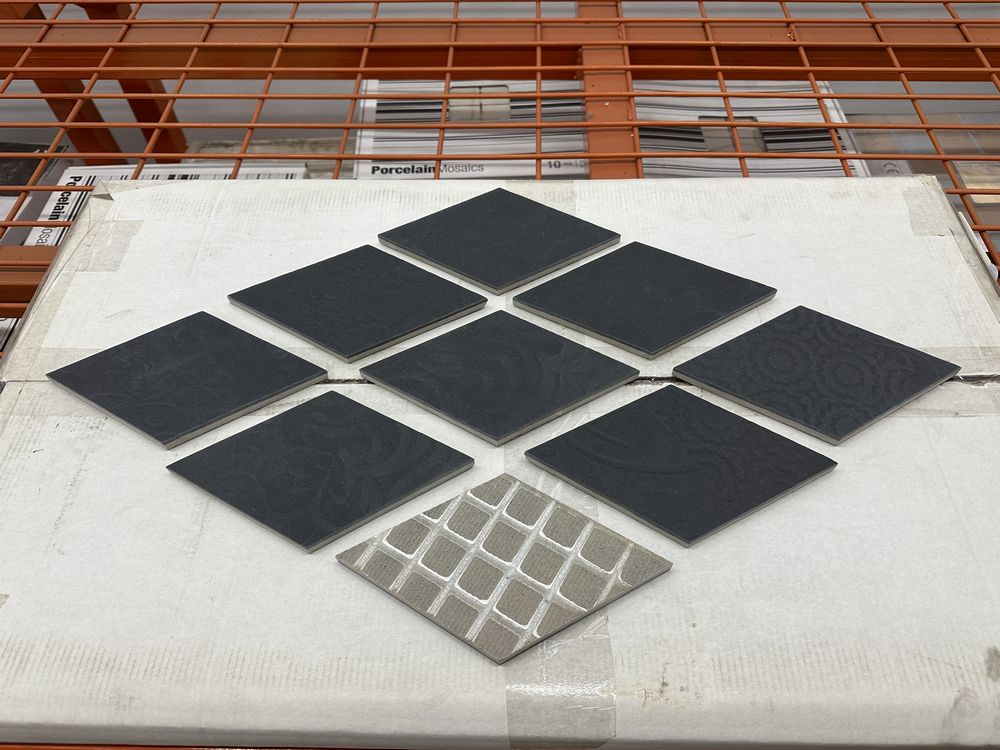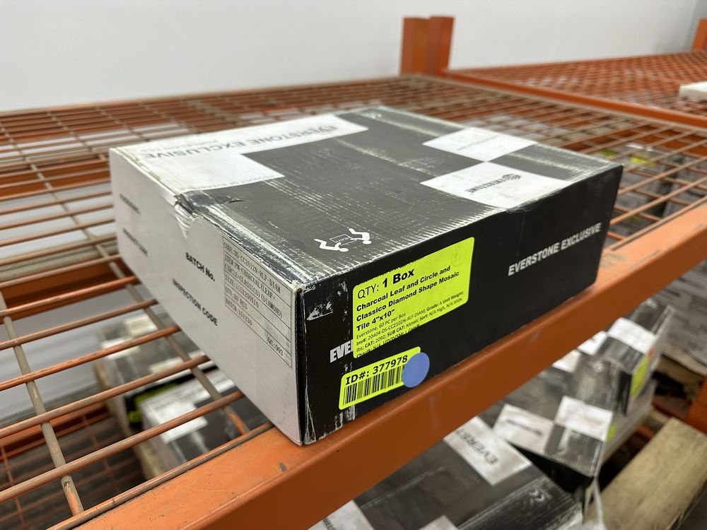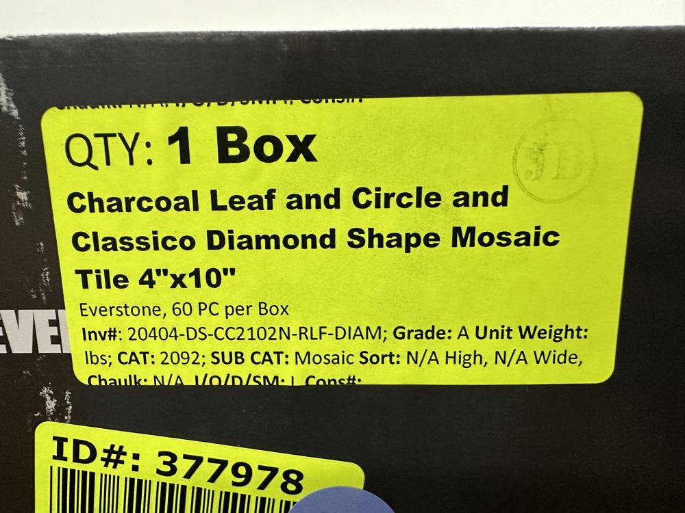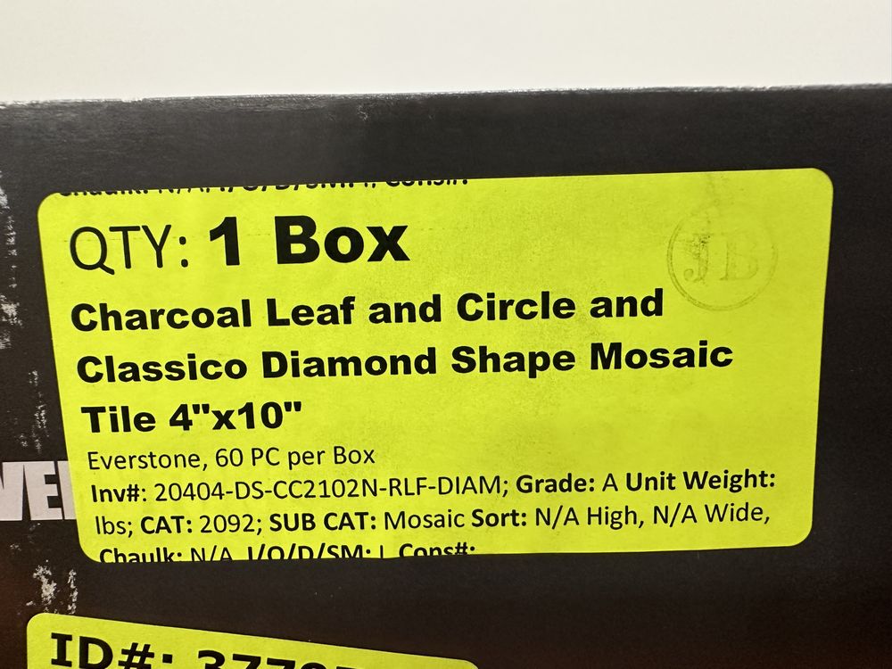 Charcoal Leaf and Circle and Classico Diamond Shape Mosaic Tile 4"x10". Everstone, 6 Boxes, 60 Pieces per box Grade: A,This is a liquidated product. Any pre-existing retail, wholesale or manufacturer warranties will not transfer with the sale of this Product unless expressly stated otherwise. Weight: x. Sold by: Box. Sold as: Quantity X Price. Inventory #: 20404-DS-CC2102N-RLF-DIAM