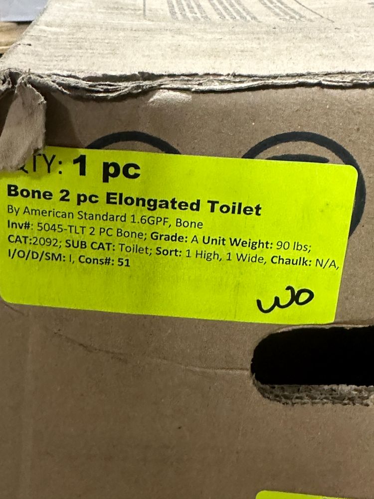 Bone 2 Piece Elongated Toilet. By American Standard 1.6GPF, Bone, Grade: A,This is a liquidated product. Any pre-existing retail, wholesale or manufacturer warranties will not transfer with the sale of this Product unless expressly stated otherwise. Weight: 90. Sold by: Piece. Sold as: Quantity X Price. Inventory #: 5045-TLT 2 PC Bone
