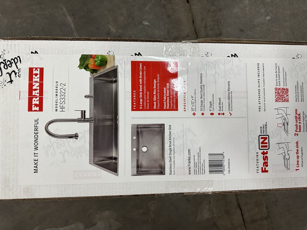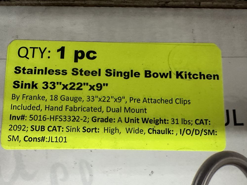 Stainless Steel Single Bowl Kitchen Sink 33"x22"x9". By Franke, 18 Gauge, 33"x22"x9", Pre Attached Clips Included, Hand Fabricated, Dual Mount, Grade: A,This is a liquidated product. Any pre-existing retail, wholesale or manufacturer warranties will not transfer with the sale of this Product unless expressly stated otherwise. Weight: 31. Sold by: Piece. Sold as: Quantity X Price. Inventory #: 5016-HFS3322-2