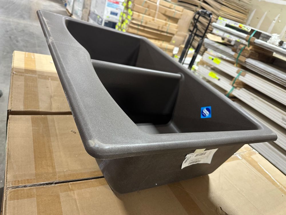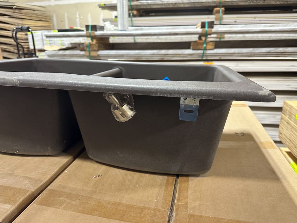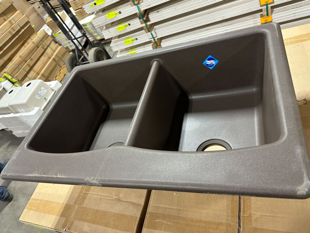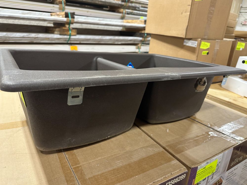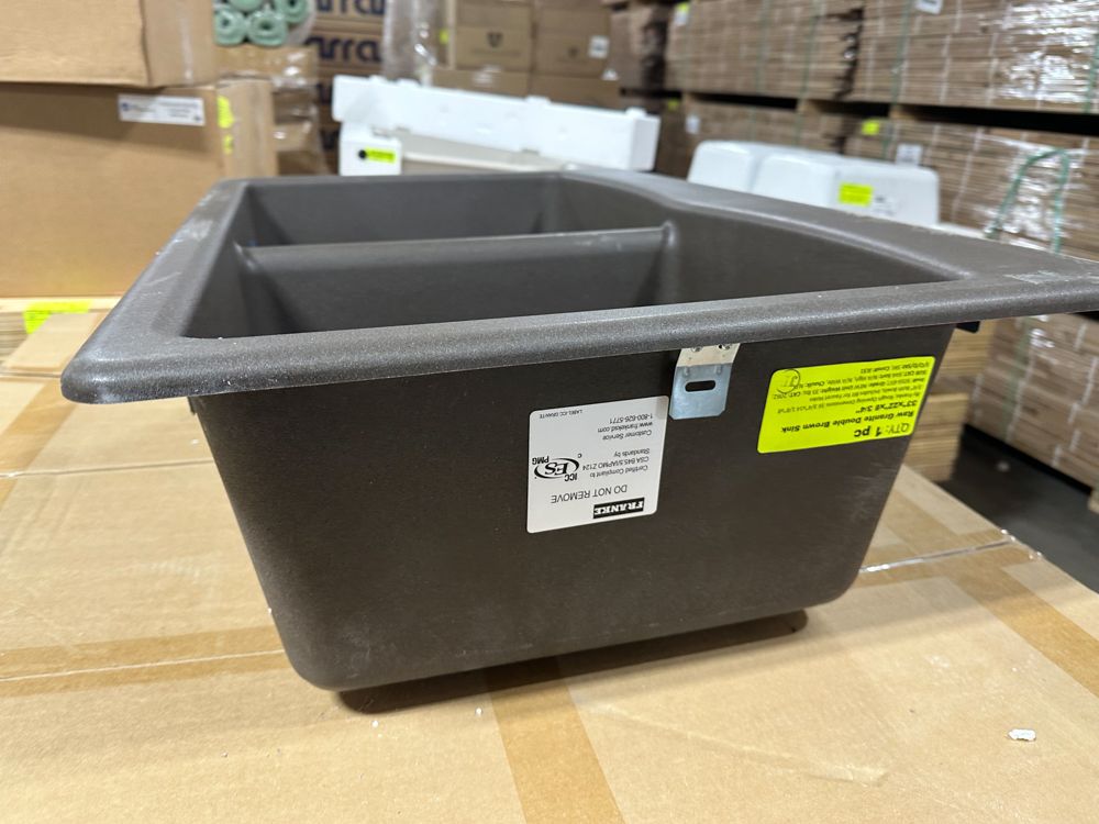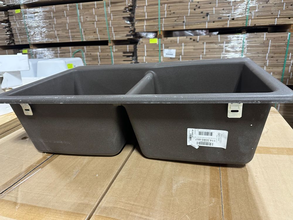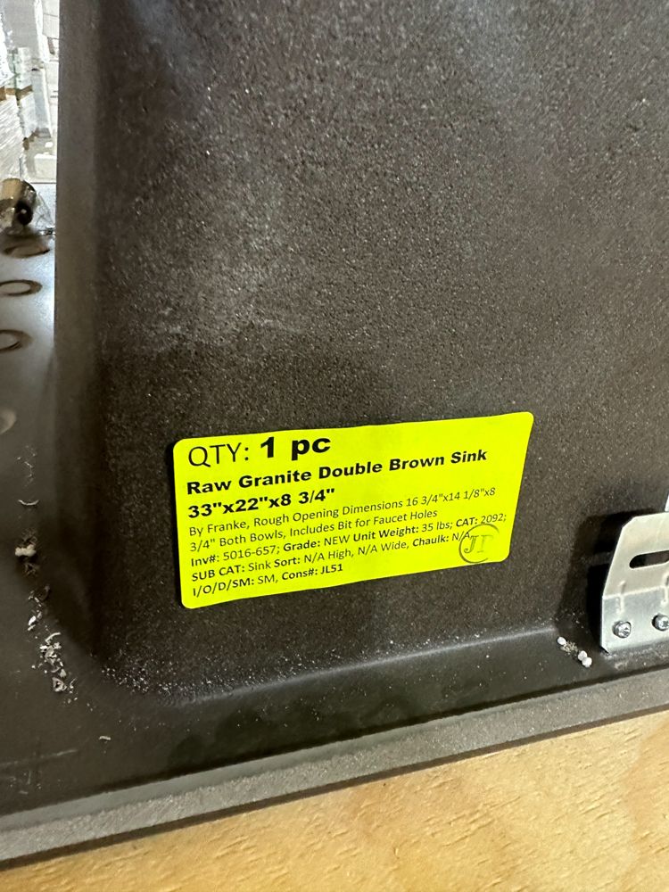 Raw Granite Double Brown Sink 33"x22"x8 3/4". By Franke, Rough opening dimensions 16 3/4"x14 1/8"x8 3/4" Both bowls, bits for faucet holes NOT INCLUDED. Grade: New,This is a liquidated product. Any pre-existing retail, wholesale or manufacturer warranties will not transfer with the sale of this Product unless expressly stated otherwise. Weight: 35 lbs.. Sold by: Piece. Sold as: Quantity X Price. Inventory #: 5016-657