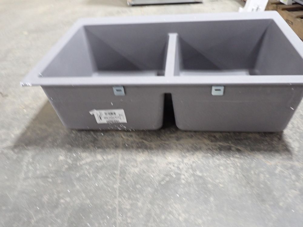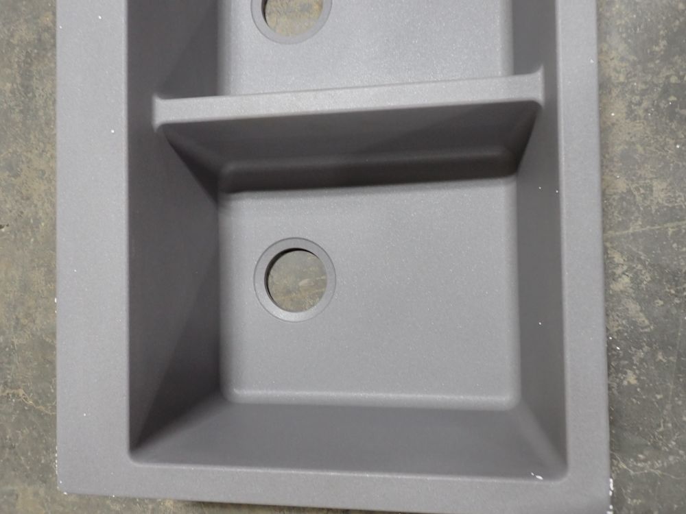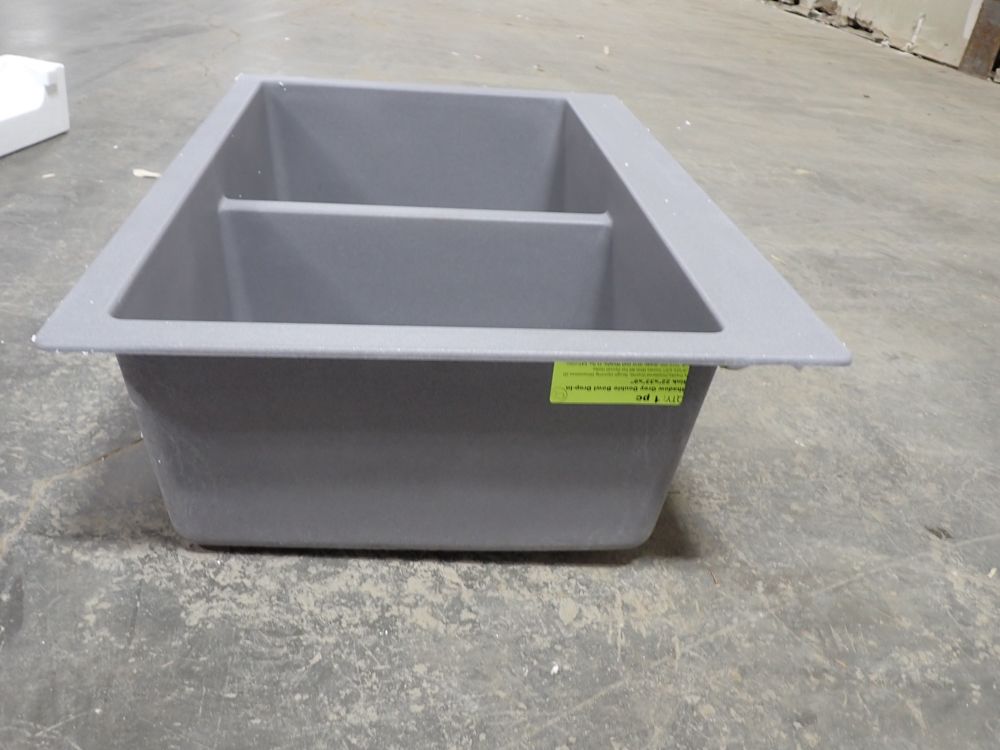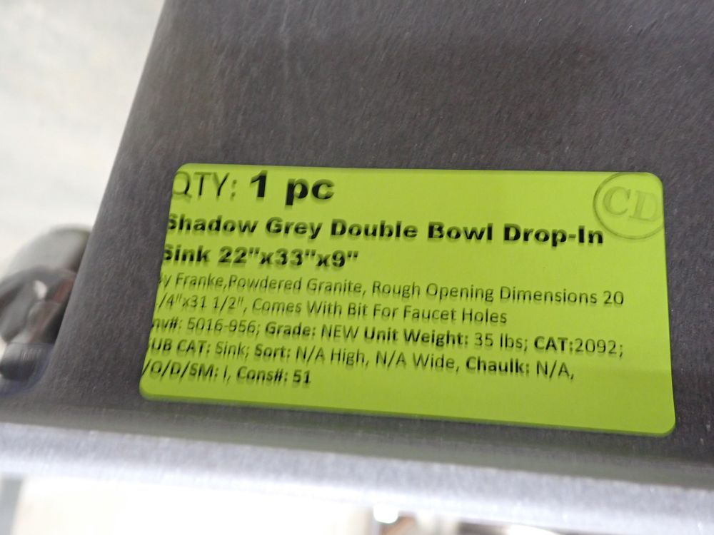 Shadow Grey Double Bowl Drop-In Sink 22"x33"x9". By Franke, Powdered Granite, rough opening dimensions 20 1/4"x31 1/2", Comes with bit for faucet holes. Grade: New This is a liquidated product. Any pre-existing retail, wholesale or manufacturer warranties will not transfer with the sale of this Product unless expressly stated otherwise. Weight: 35 lbs.. Sold by: Piece. Sold as: Quantity X Price. Inventory #: 5016-956