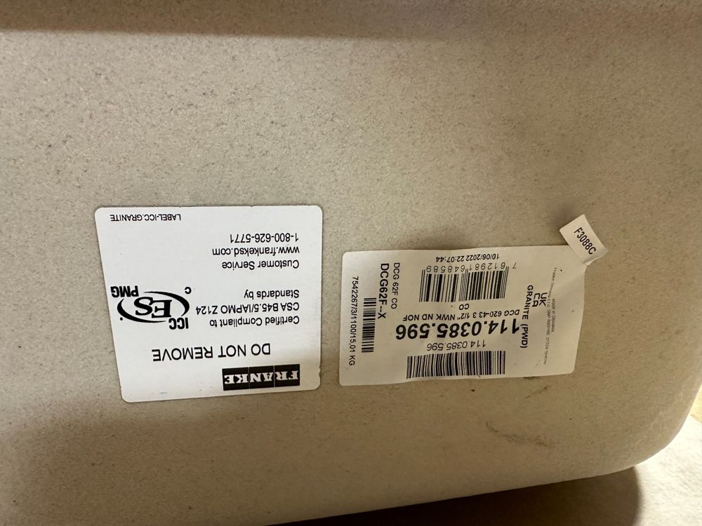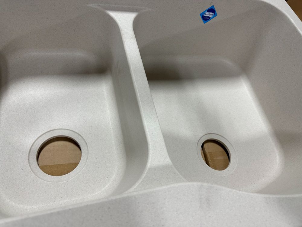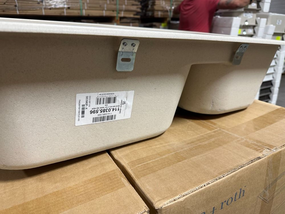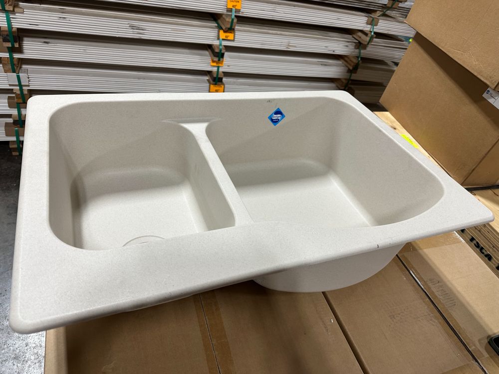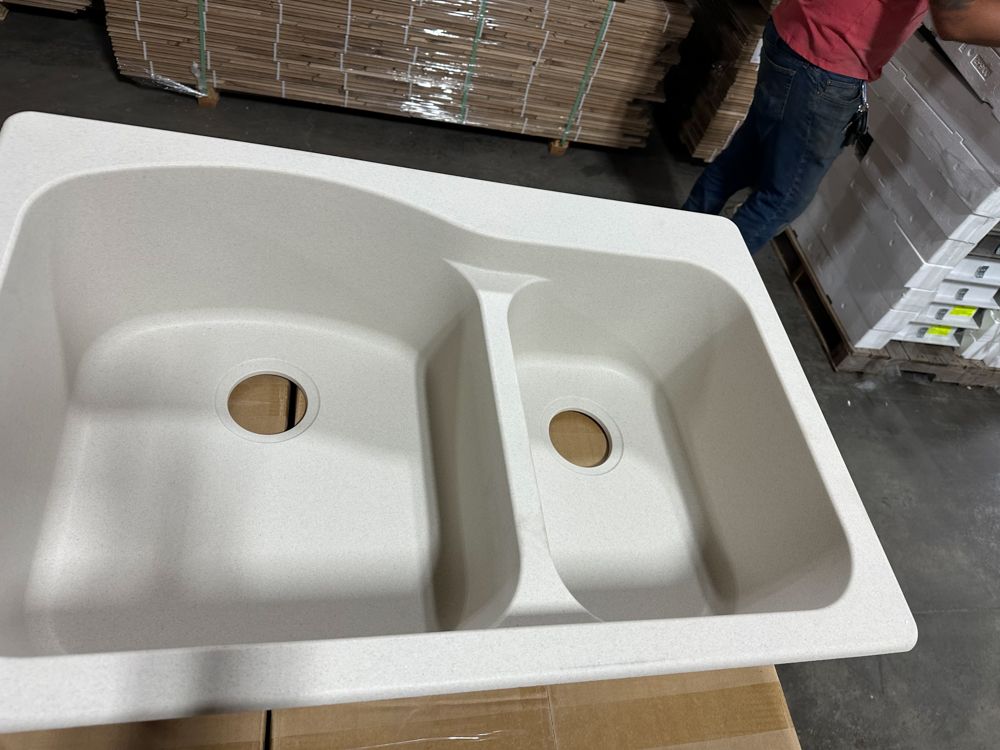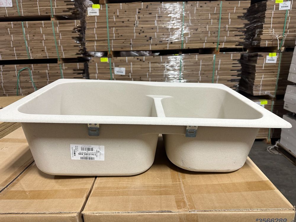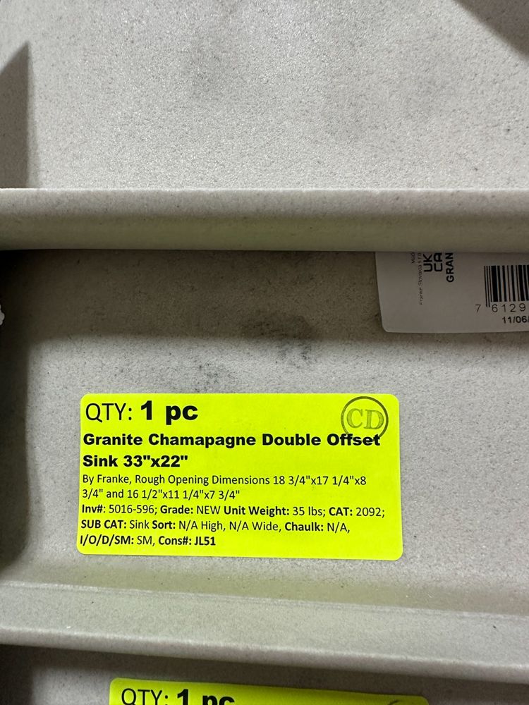 Granite Champagne Double Offset Sink 33"x22" No Drill Bit. By Franke, Rough opening dimensions 18 3/4"x17 1/4"x8 3/4" and 16 1/2"x11 1/4"x7 3/4". Grade: New, DOES NOT INCLUDE DRILL BIT FOR FAUCET HOLES,This is a liquidated product. Any pre-existing retail, wholesale or manufacturer warranties will not transfer with the sale of this Product unless expressly stated otherwise. Weight: 35 lbs.. Sold by: Piece. Sold as: Quantity X Price. Inventory #: 5016-596