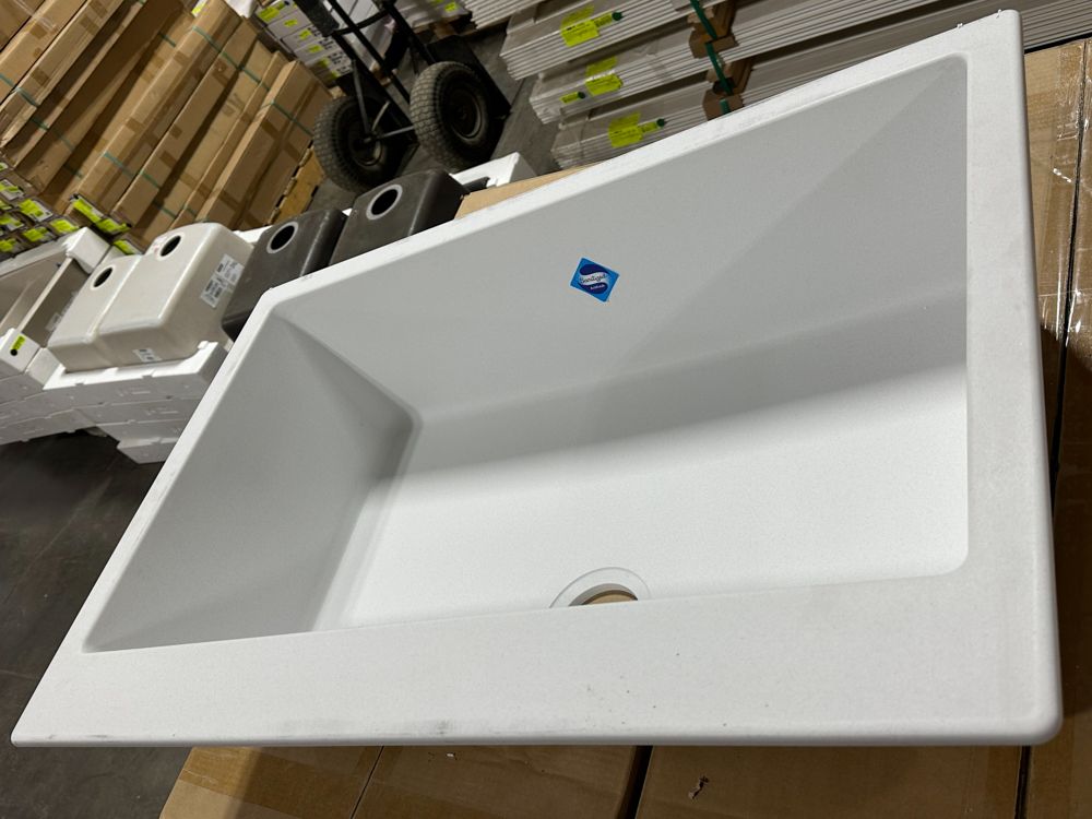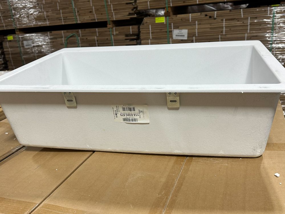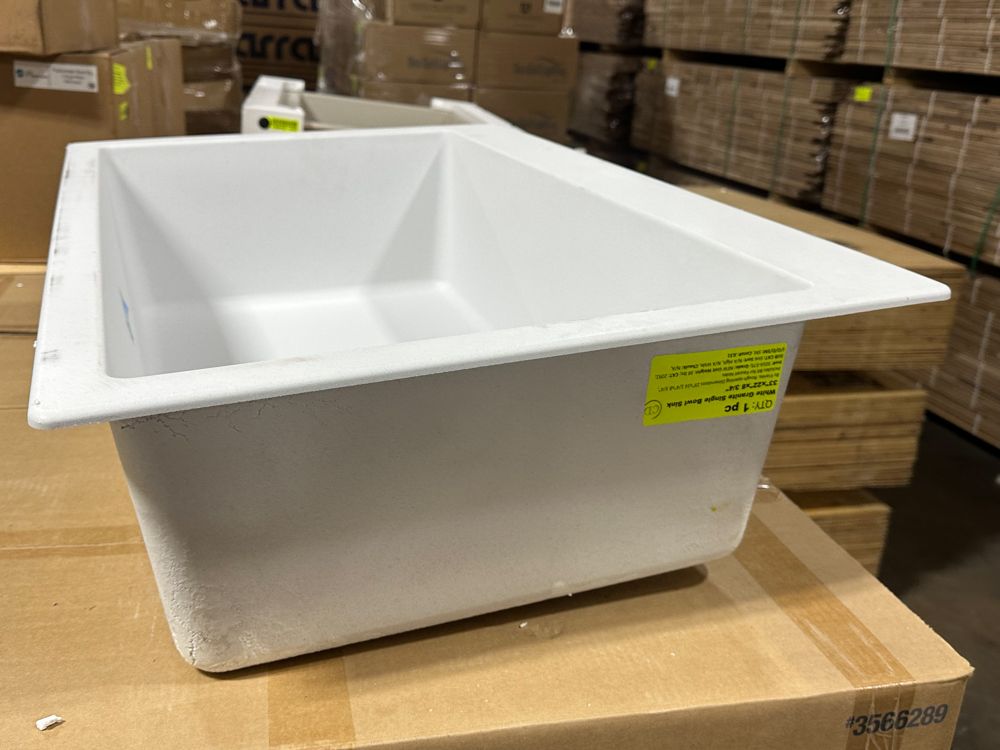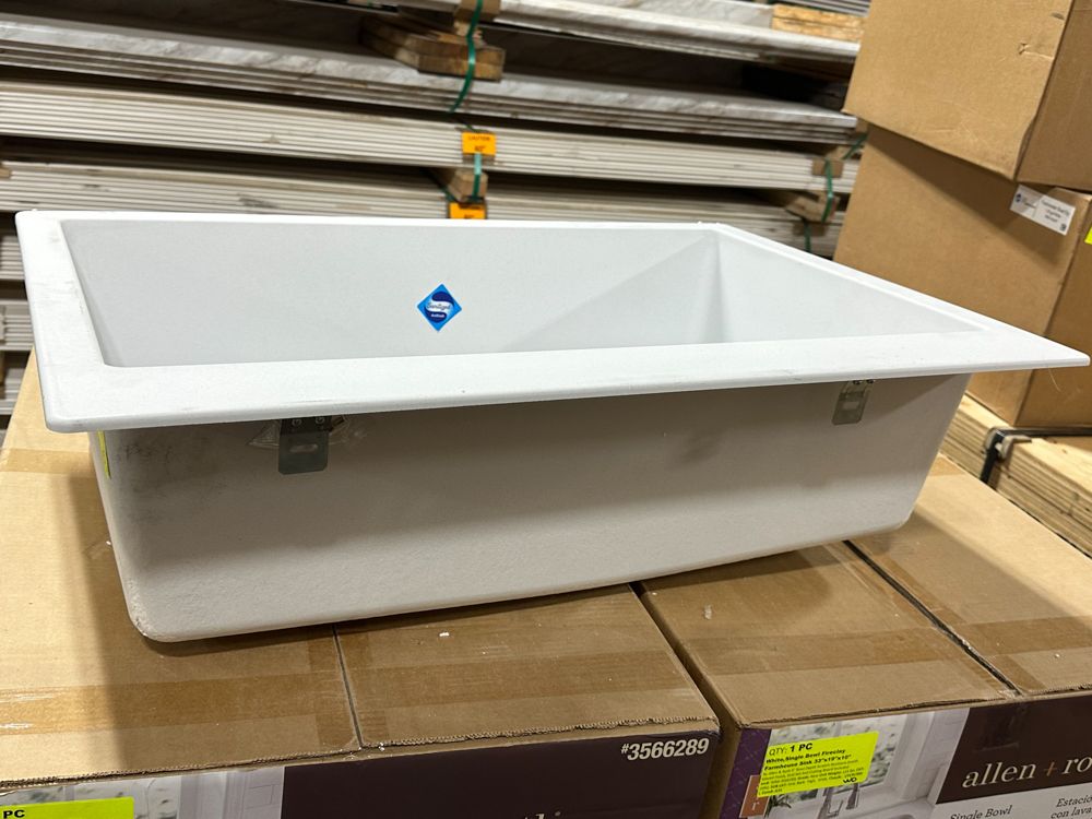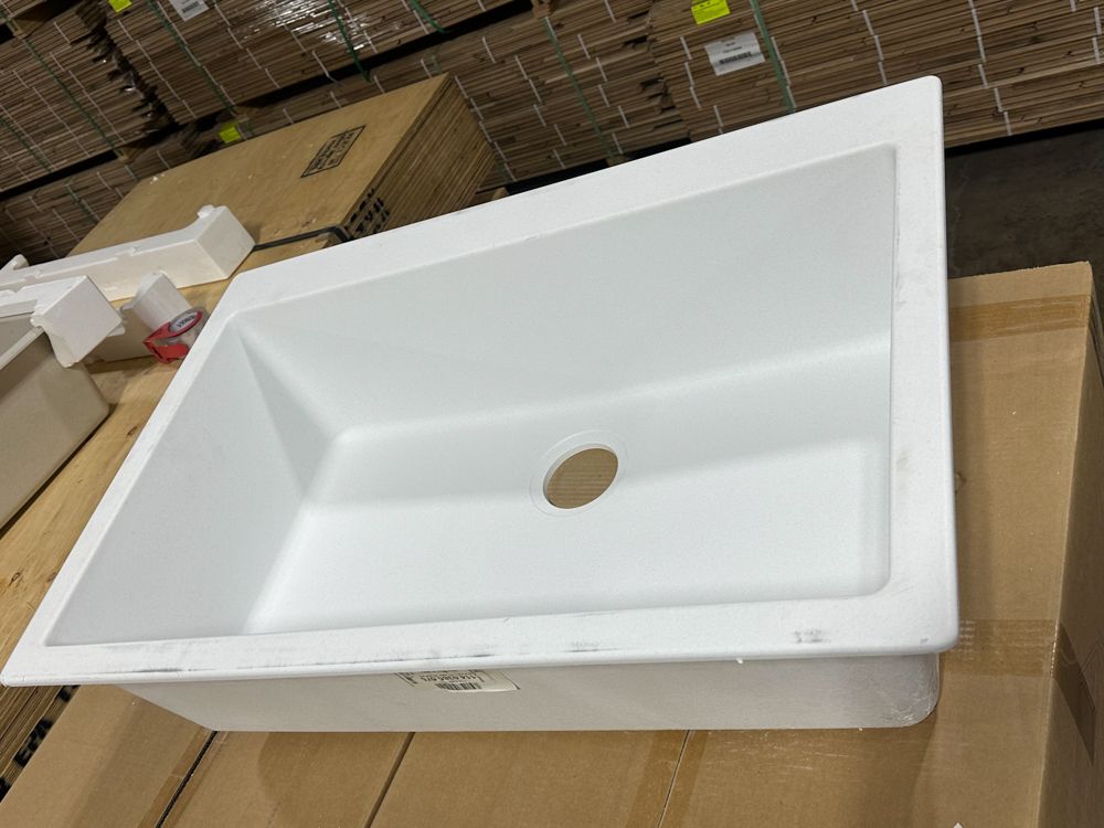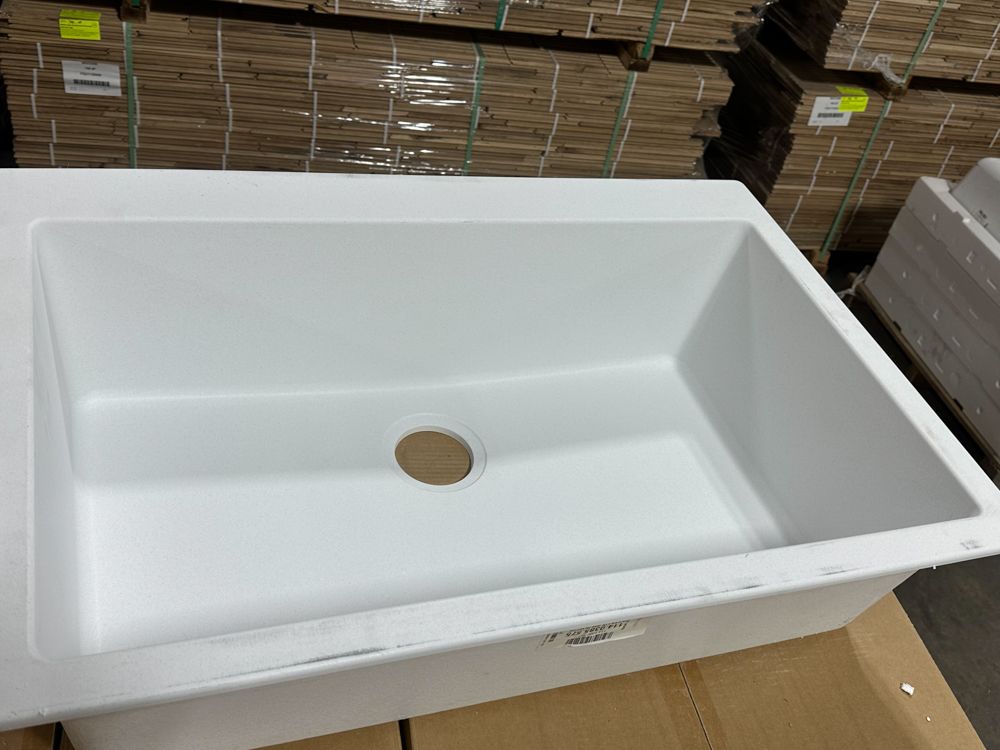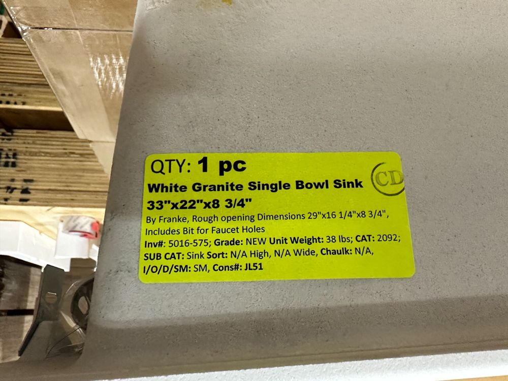 White Granite Single Bowl Sink 33"x22"x8 3/4". By Franke, Rough Opening Dimensions 29"x16 1/4"x8 3/4", Includes Bit For Faucet Holes Grade: New This is a liquidated product. Any pre-existing retail, wholesale or manufacturer warranties will not transfer with the sale of this Product unless expressly stated otherwise. Weight: 38lbs. Sold by: Piece. Sold as: Quantity X Price. Inventory #: 5016-575