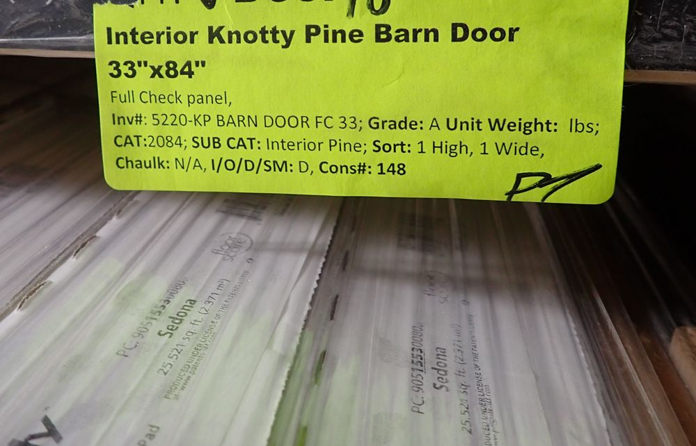 Interior Knotty Pine Barn Door 33"x84". 3/8x33"x84" Full Check Interior Knotty Pine Door, Grade: A,This is a liquidated product. The Auction Company makes no express or implied representations or warranties of any kind regarding the Product. Any pre-existing retail, wholesale or manufacturer warranties will not transfer with the sale of this Product unless expressly stated otherwise on this page. The Buyer accepts the Product in as-is condition, with all faults. Weight: x. Sold by: Door. Sold as: Quantity X Price. Inventory #: 5220-KP BARN DOOR FC 33