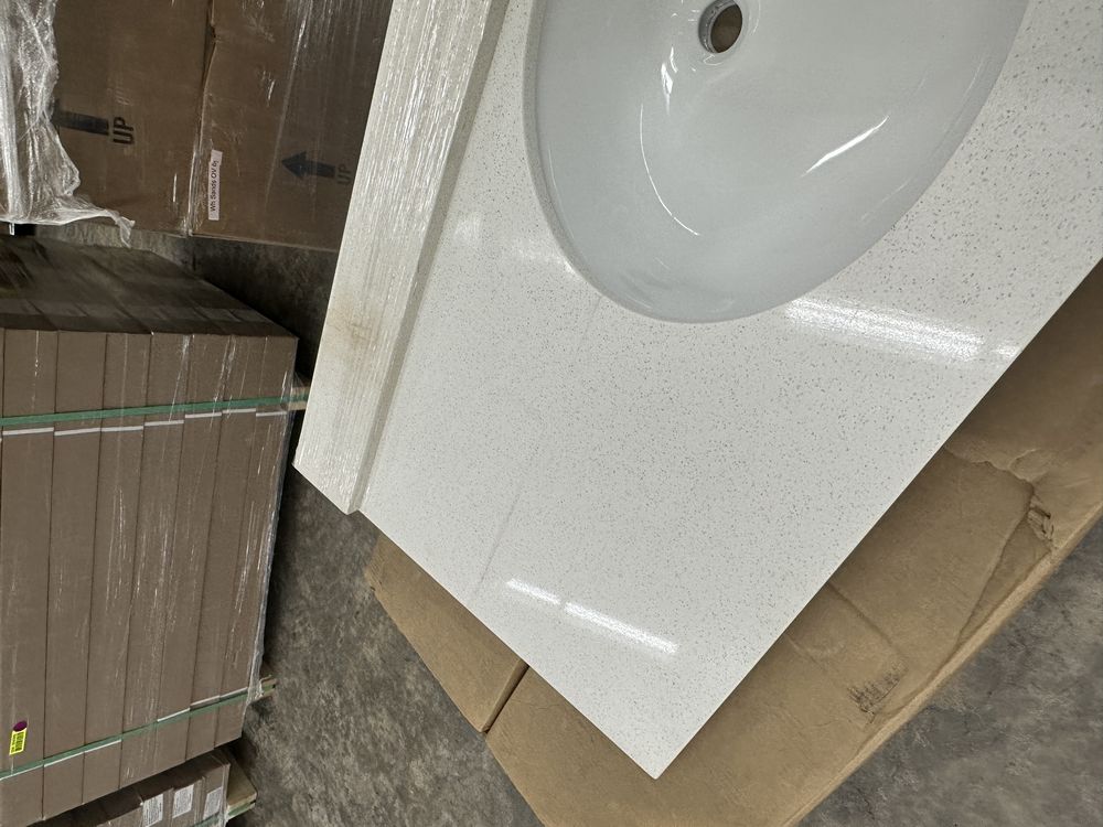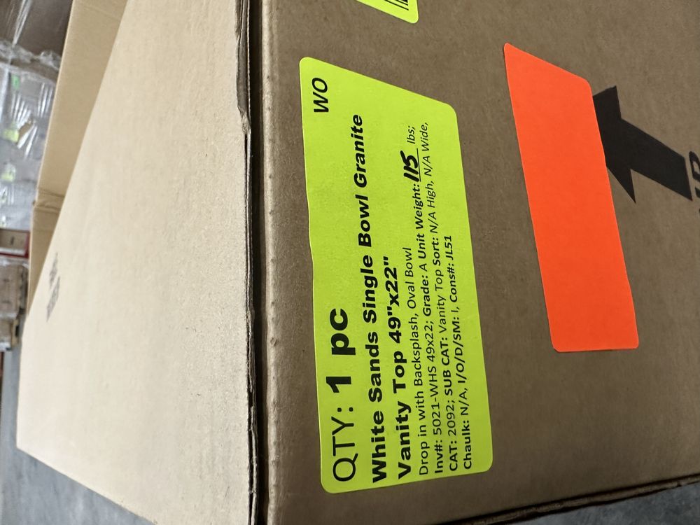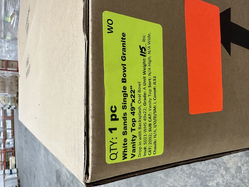 White Sands Single Bowl Granite Vanity Top 49"x22". Drop in with Backsplash, Oval Bowl. Grade: A. This is a liquidated product. Any pre-existing retail, wholesale or manufacturer warranties will not transfer with the sale of this Product unless expressly stated otherwise. This is a liquidated product. Any pre-existing retail, wholesale or manufacturer warranties will not transfer with the sale of this Product unless expressly stated otherwise. Weight: 115. Sold by: Piece. Sold as: Quantity X Price. Inventory #: 5021-WHS 49x22