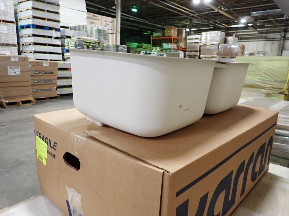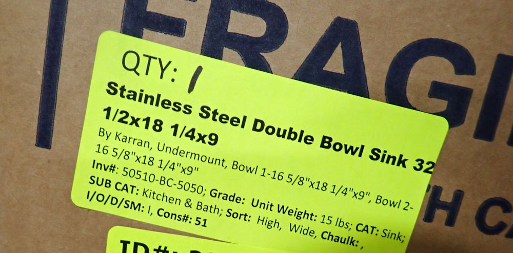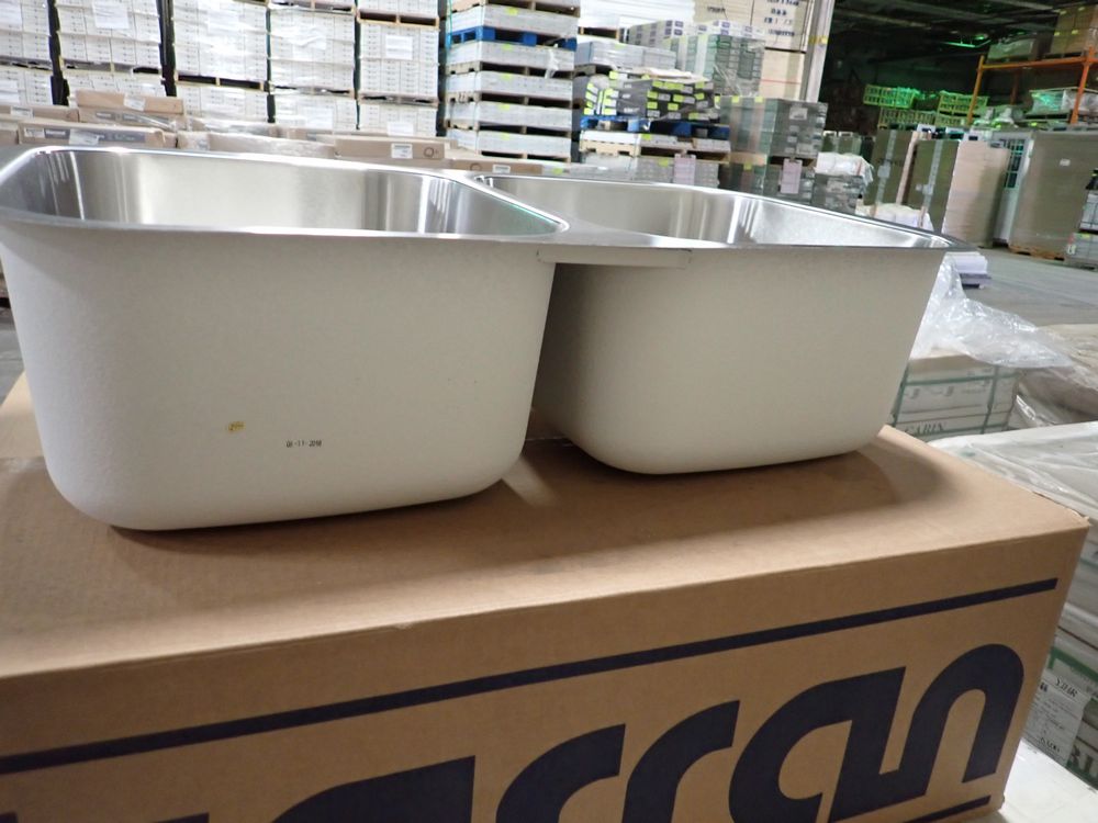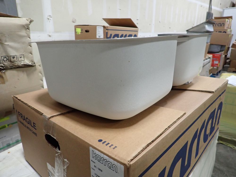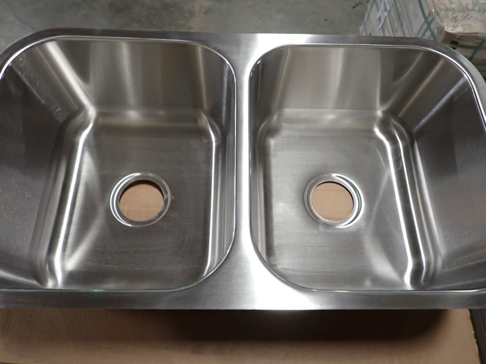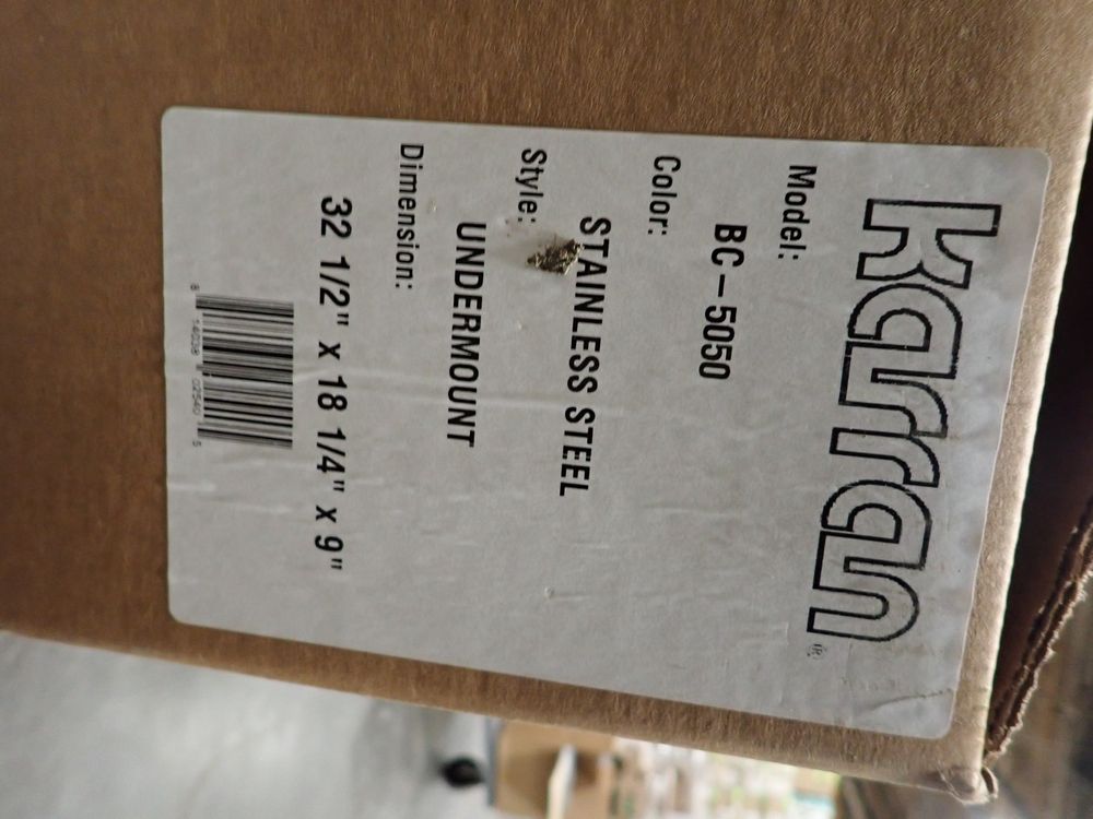 Stainless Steel Double Bowl Sink 32 1/2"x18 1/4"x9". By Karran, undermount, Bowl 1- 16 5/8"x18 1/4"x9", Bowl 2- 16 5/8"x18 1/4"x9" This is a liquidated product. Any pre-existing retail, wholesale or manufacturer warranties will not transfer with the sale of this Product unless expressly stated otherwise. Weight: 15 lbs.. Sold by: Piece. Sold as: Quantity X Price. Inventory #: 50510-BC-5050