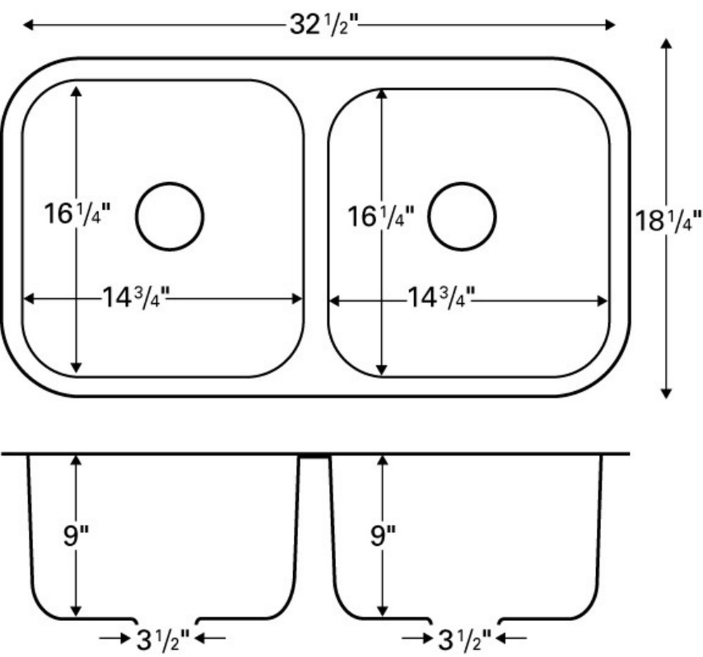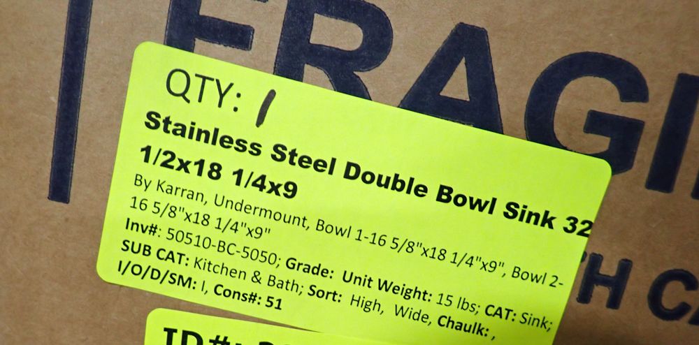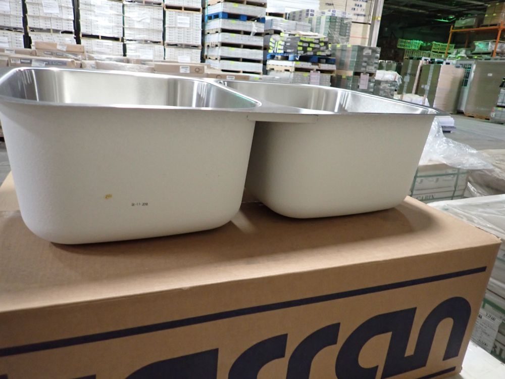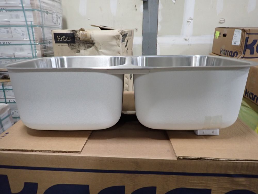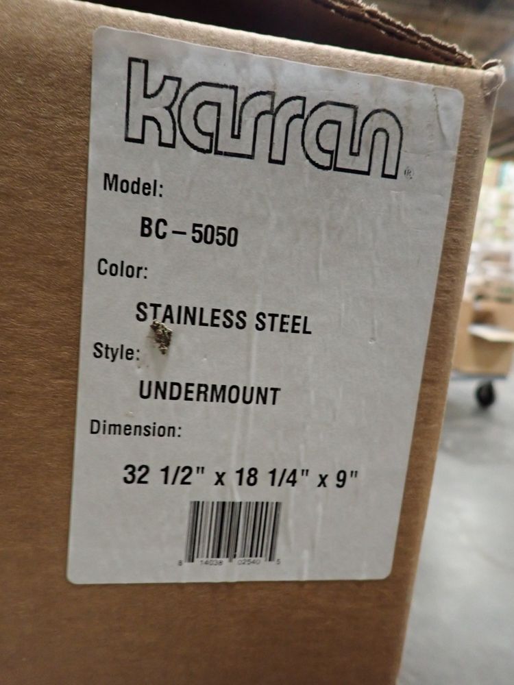 Stainless Steel Double Bowl Sink 32 1/2"x18 1/4"x9". By Karran, Undermount, Bowl 1: 16 5/8"x18 1/4"x9", Bowl 2: 16 5/8"x18 1/4"x9",This is a liquidated product. Any pre-existing retail, wholesale or manufacturer warranties will not transfer with the sale of this Product unless expressly stated otherwise. Weight: 15 lbs.. Sold by: Piece. Sold as: Quantity X Price. Inventory #: 50510-BC-5050