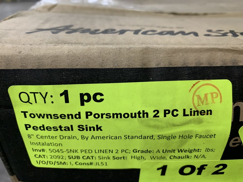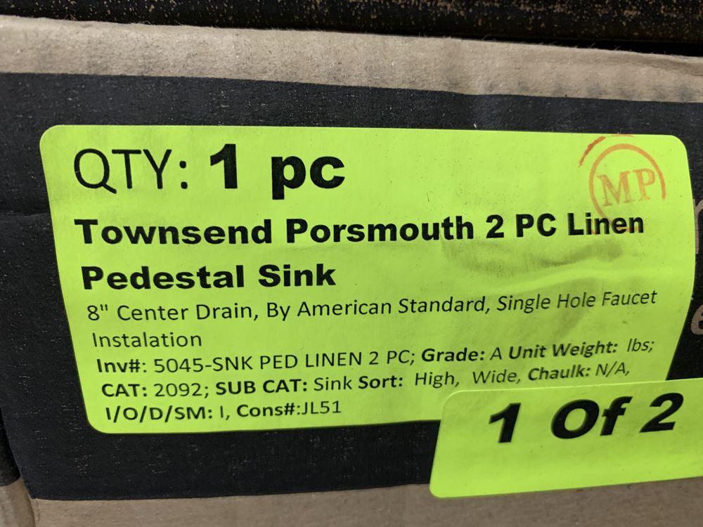Townsend 2 Piece Linen Pedestal Sink. 8" Center Drain, By American Standard, 3 Hole Faucet installation Grade A,This is a liquidated product. Any pre-existing retail, wholesale or manufacturer warranties will not transfer with the sale of this Product unless expressly stated otherwise. Weight: X. Sold by: Piece. Sold as: Quantity X Price. Inventory #: 5045-SNK PED LINEN 2PC