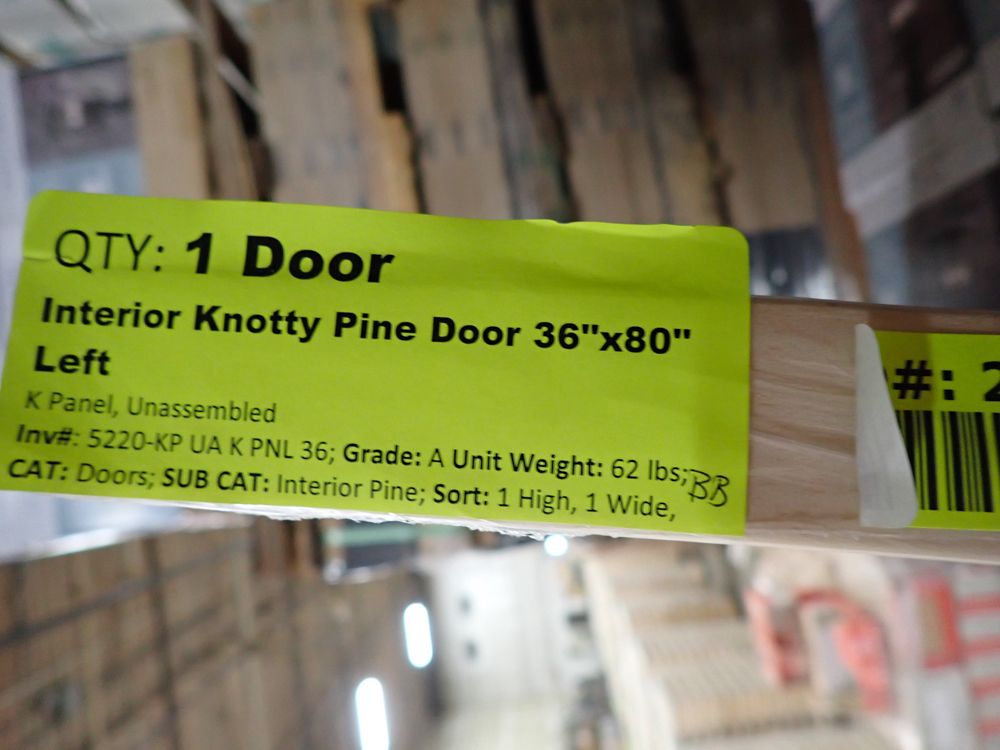Interor Knotty Pine Door 36"x80" LH K PNL. K PNL LH Grade: A,This is a liquidated product. The Auction Company makes no express or implied representations or warranties of any kind regarding the Product. Any pre-existing retail, wholesale or manufacturer warranties will not transfer with the sale of this Product unless expressly stated otherwise on this page. The Buyer accepts the Product in as-is condition, with all faults. Weight: x. Sold by: Door. Sold as: Quantity X Price. Inventory #: 5220-KP UA K PNL 36 LH