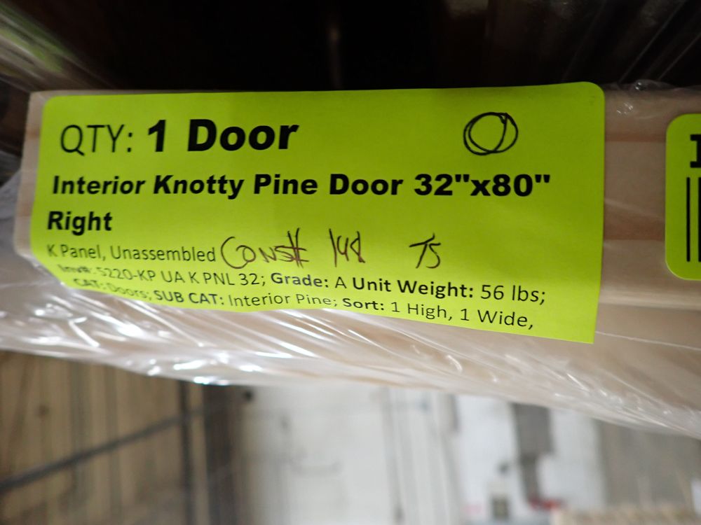 Interior Knotty Pine Door 32"x80" RH K PNL. K PNL RH Grade: A,This is a liquidated product. The Auction Company makes no express or implied representations or warranties of any kind regarding the Product. Any pre-existing retail, wholesale or manufacturer warranties will not transfer with the sale of this Product unless expressly stated otherwise on this page. The Buyer accepts the Product in as-is condition, with all faults. Weight: x. Sold by: Door. Sold as: Quantity X Price. Inventory #: 5220-KP UA K PNL 32 RH