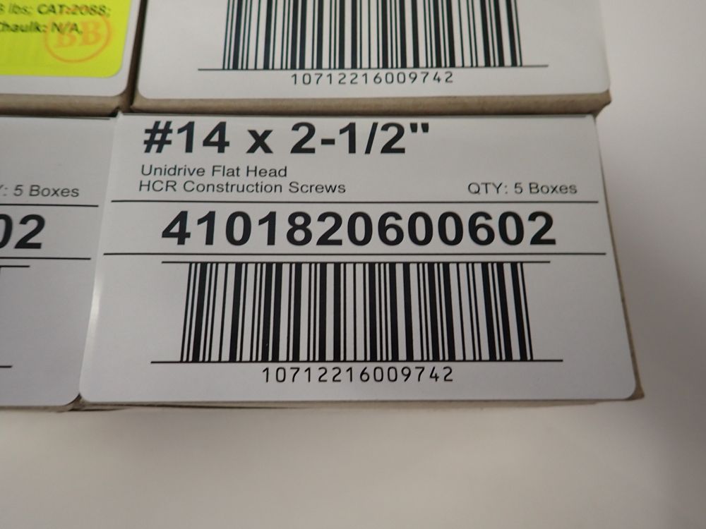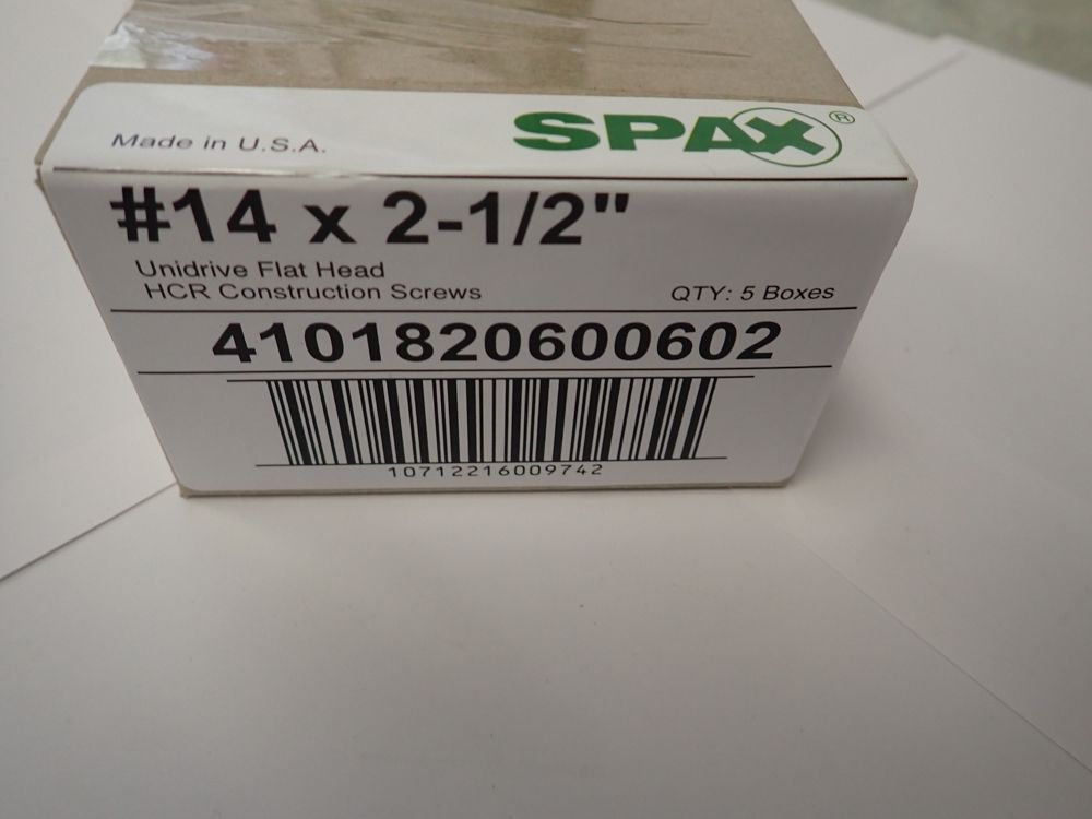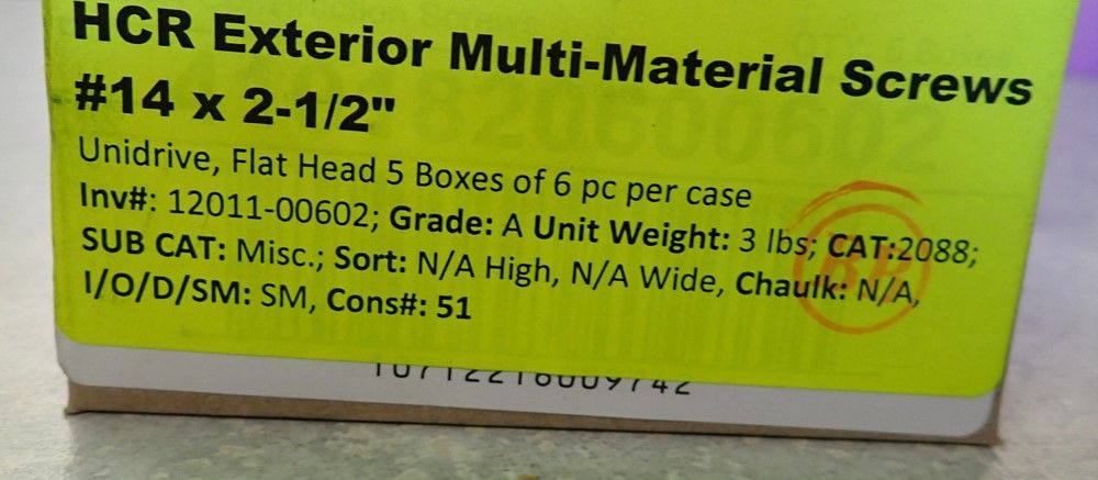 HCR Exterior Multi-Material Screws #14 x 2-1/2". Unidrive, Flat Head, 5 Boxes of 6 Pieces Per Case,This is a liquidated product. No warranties are expressed or implied Weight: 3. Sold by: Case. Sold as: Quantity X Price. Inventory #: 12011-00602