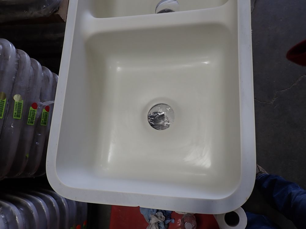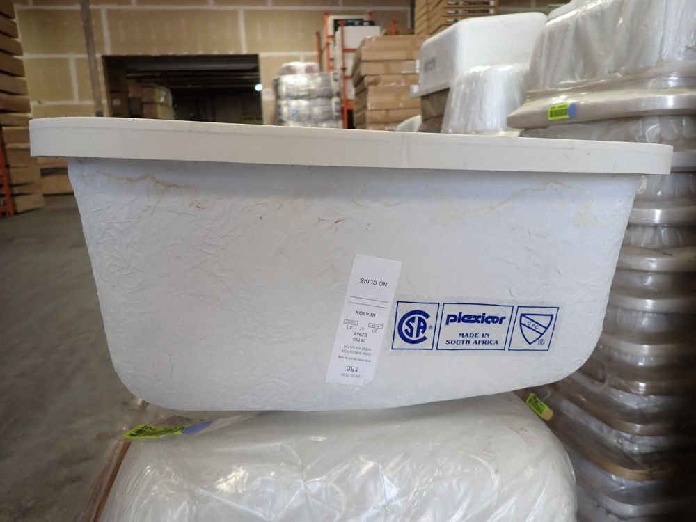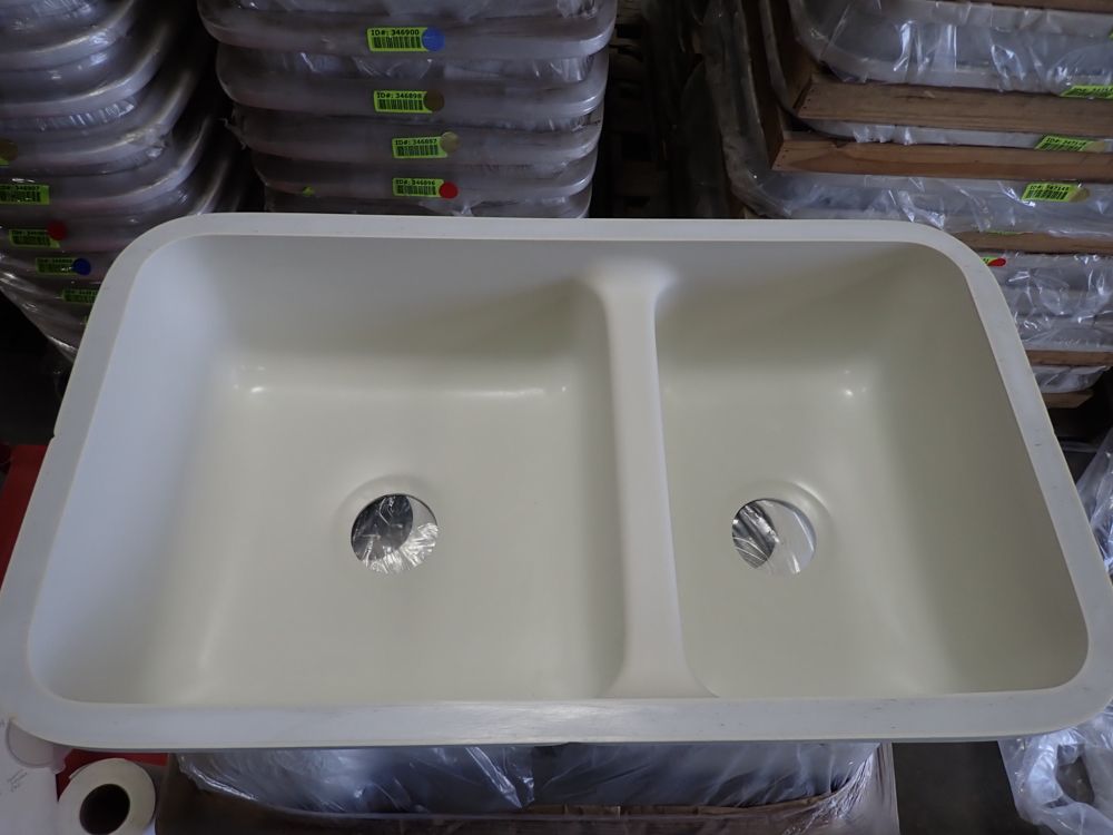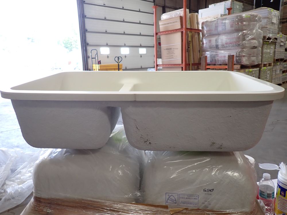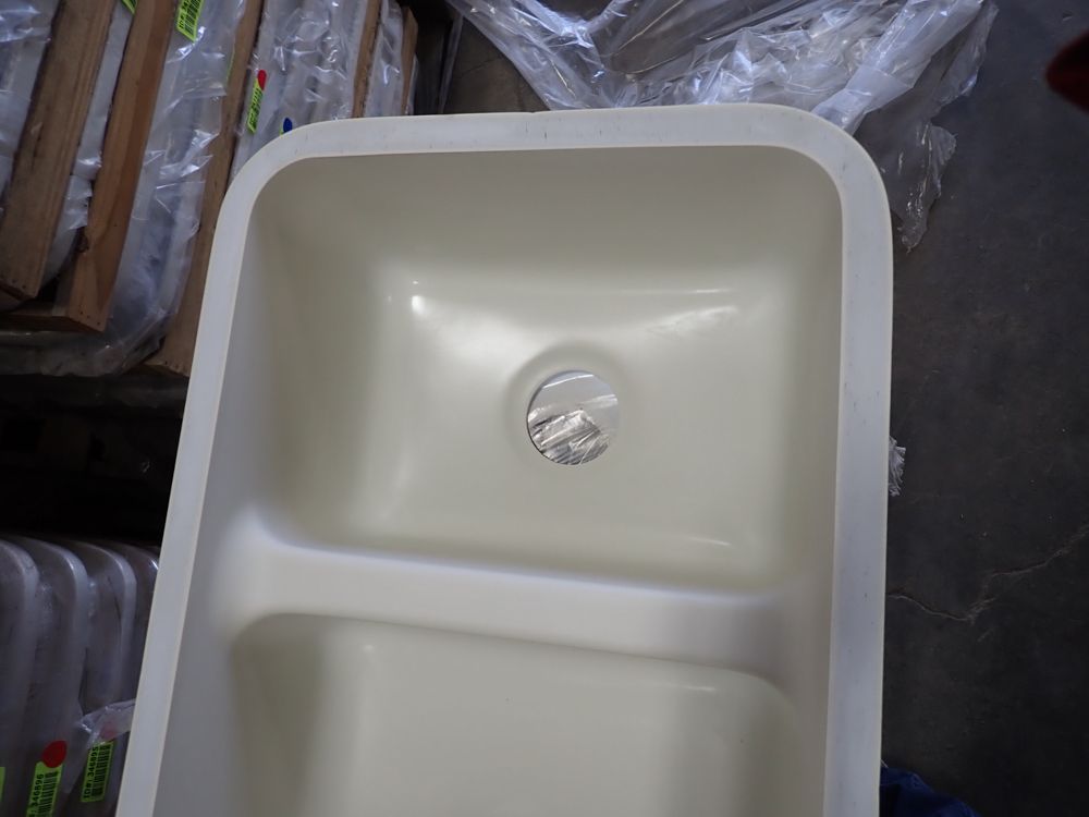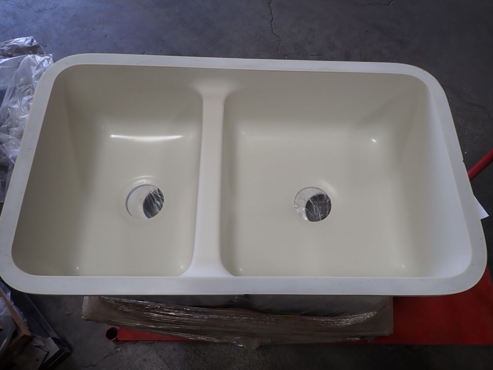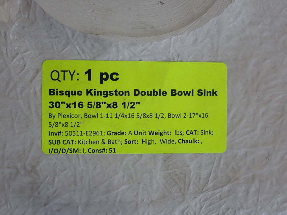 Bisque Kingston Double Bowl Sink 30"x16 5/8"x8 1/2". By Plexicor, Bowl One 11 1/4x16 5/8x8 1/2, Bowl Two 17"x16 5/8"x8 1/2", Grade: A. This is a liquidated product. Any pre-existing retail, wholesale or manufacturer warranties will not transfer with the sale of this Product unless expressly stated otherwise. Weight: X. Sold by: Piece. Sold as: Quantity X Price. Inventory #: 50511-E2961