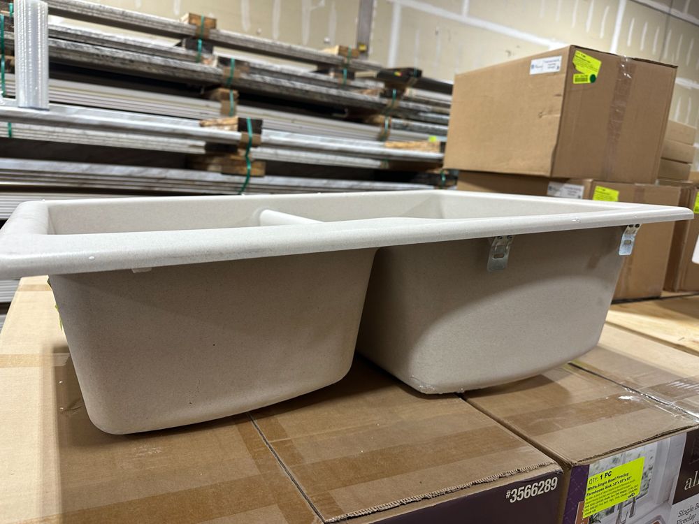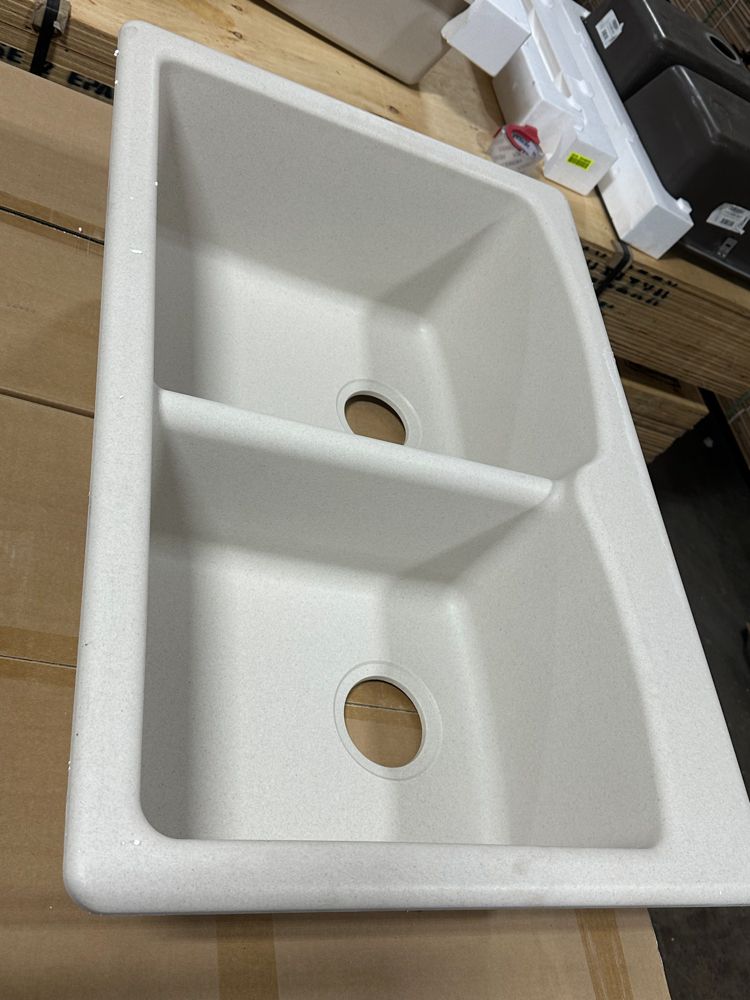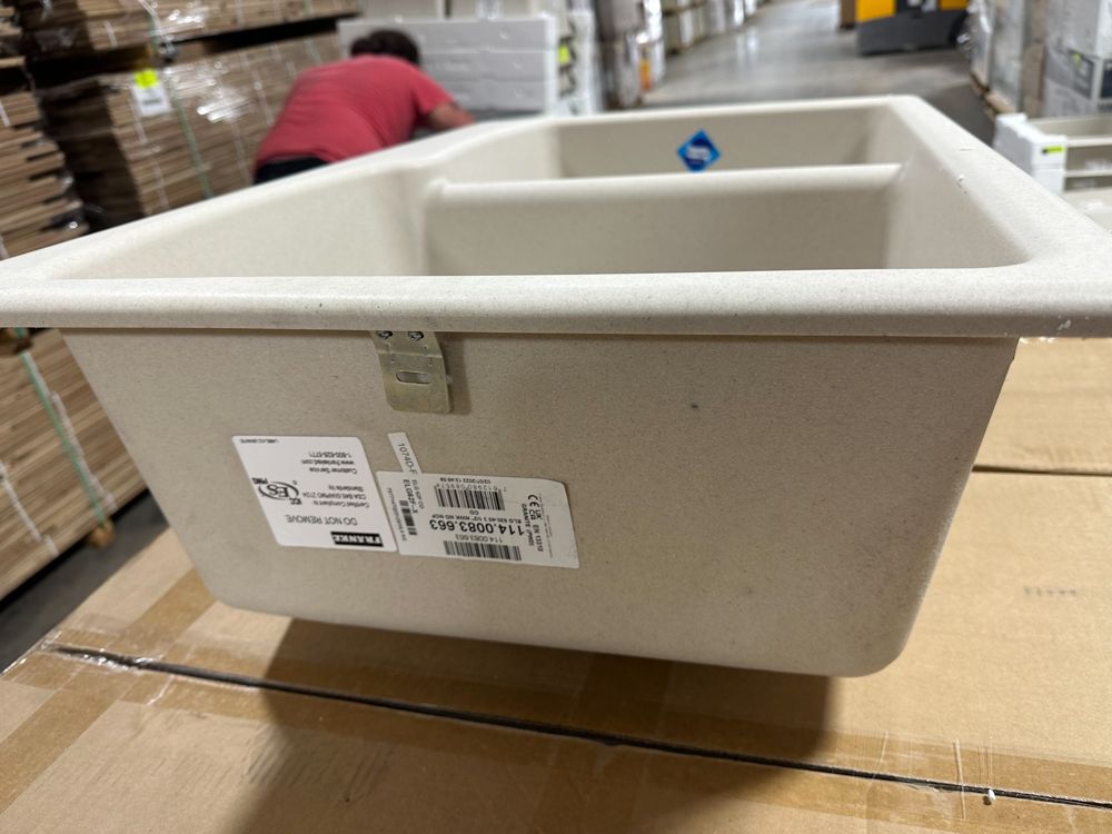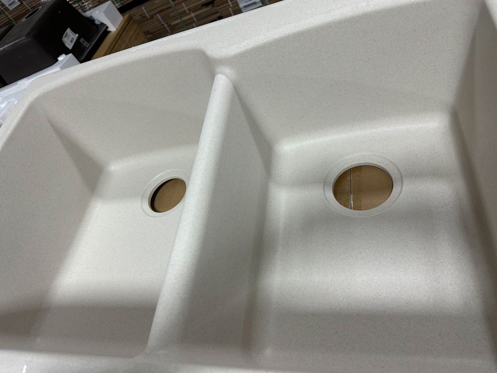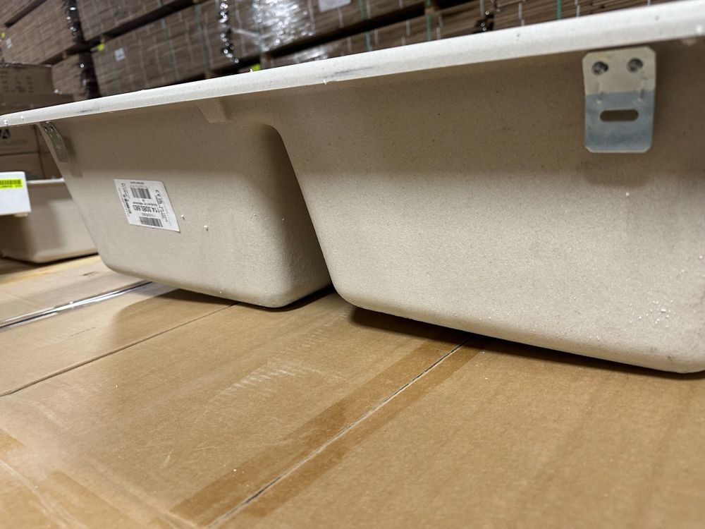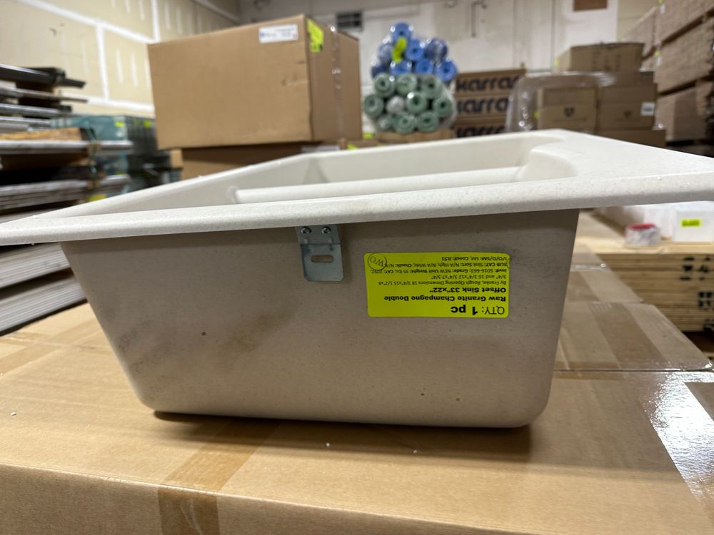Raw Granite Champagne Double Offset Sink 33"x22". By Franke, No Drill Bit Included, Rough opening dimensions 18 3/4"x15 1/2"x8 3/4", and 16 3/4"x12 3/4"x7 3/4". Grade: New,This is a liquidated product. Any pre-existing retail, wholesale or manufacturer warranties will not transfer with the sale of this Product unless expressly stated otherwise. Weight: 35 lbs.. Sold by: Piece. Sold as: Quantity X Price. Inventory #: 5016-663