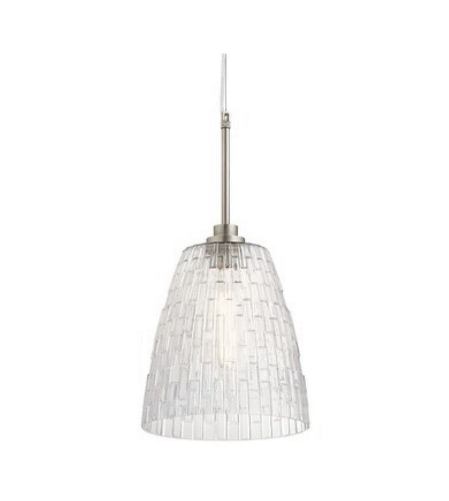 Mini Pendant Light. By Kichler, Brushed Nickel Finish, Clear Glass w/ Basket Weave Texture, 9.9"x19.61, Rod/Cable Adjust up to 78", 1 Standard Base Type-T Bulb Required, Grade: A,This is a liquidated product. Any pre-existing retail, wholesale or manufacturer warranties will not transfer with the sale of this Product unless expressly stated otherwise. Weight: 5. Sold by: Piece. Sold as: Quantity X Price. Inventory #: 2461-1048247