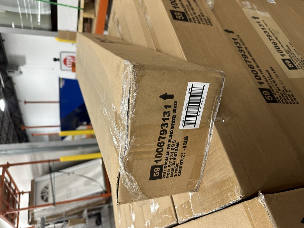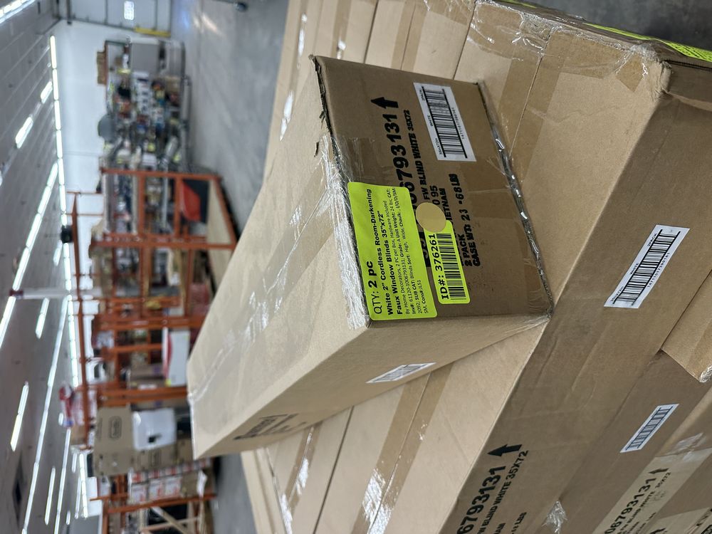 White 2" Cordless Room-Darkening Faux Window Blinds 35"x72". By Home Decorators, 2PC per Box, Hardware included. Grade A,This is a liquidated product. Any pre-existing retail, wholesale or manufacturer warranties will not transfer with the sale of this Product unless expressly stated otherwise. Weight: 24lbs. Sold by: Piece. Sold as: Quantity X Price. Inventory #: 61120-1006793131