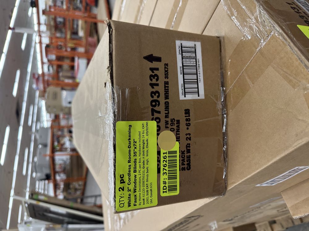 White 2" Cordless Room-Darkening Faux Window Blinds 35"x72". By Home Decorators, 2PC per Box, Hardware included. Grade A,This is a liquidated product. Any pre-existing retail, wholesale or manufacturer warranties will not transfer with the sale of this Product unless expressly stated otherwise. Weight: 24lbs. Sold by: Piece. Sold as: Quantity X Price. Inventory #: 61120-1006793131