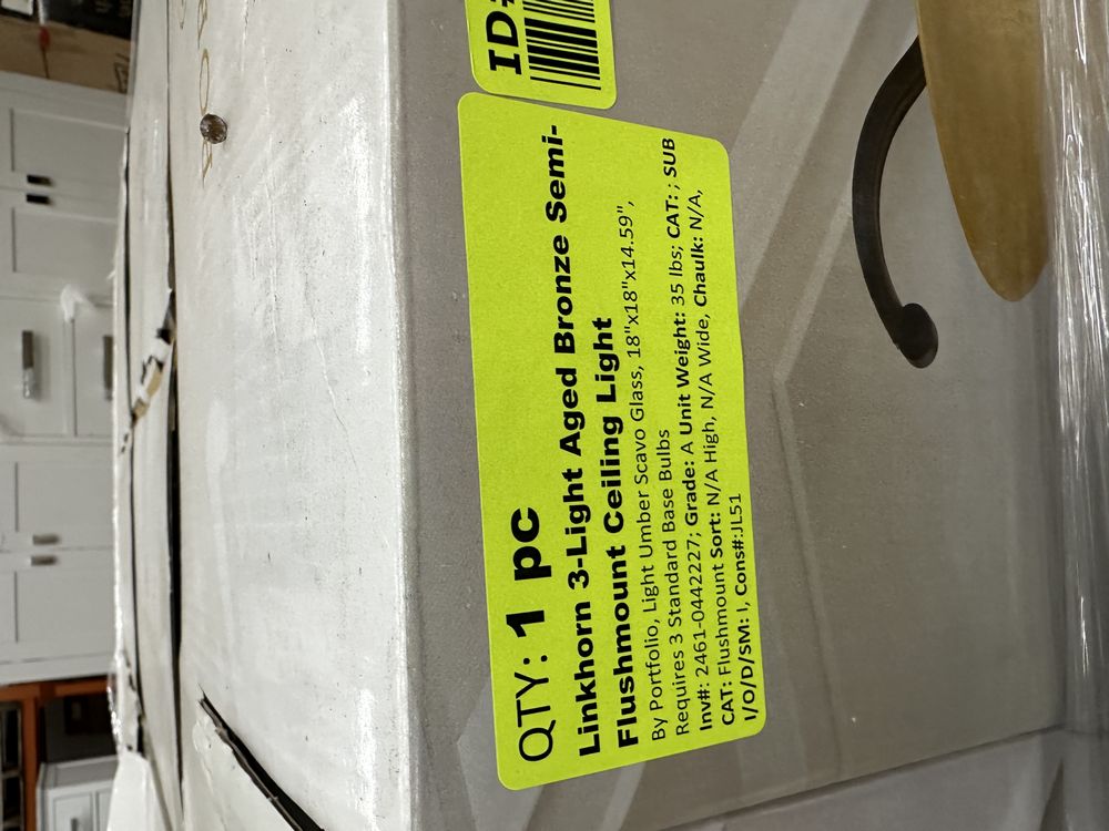 Linkhorn 3-Light Aged Bronze Semi-Flushmount Ceiling Light. By Portfolio, Light Umber Scavo Glass 18"x18"x14.59" Requires 3 standard bulbs Grade: A,This is a liquidated product. Any pre-existing retail, wholesale or manufacturer warranties will not transfer with the sale of this Product unless expressly stated otherwise. Weight: 35. Sold by: Piece. Sold as: Quantity X Price. Inventory #: 2461-0442227