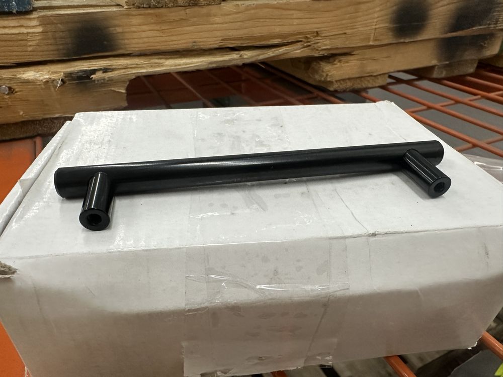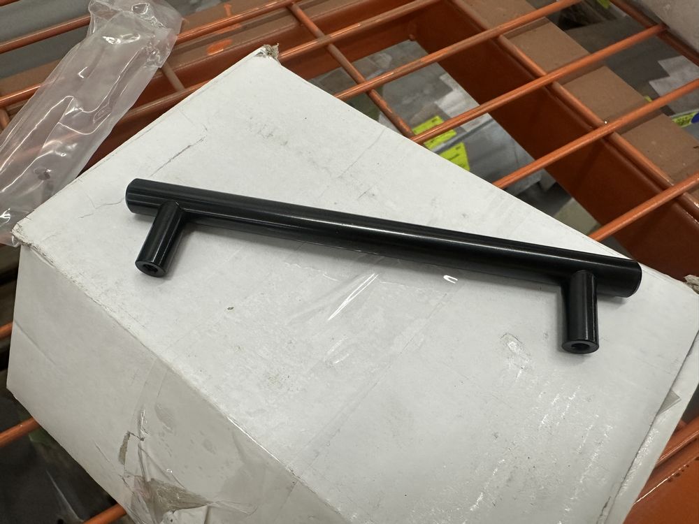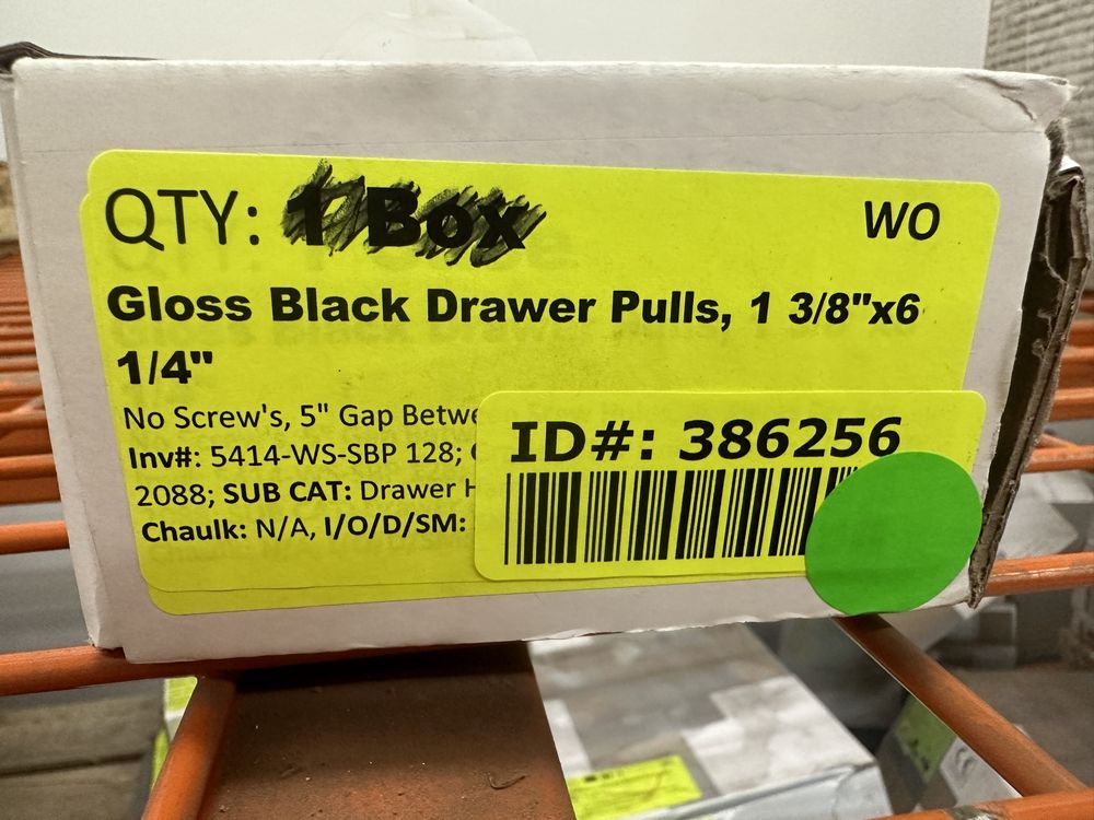 Gloss Black Drawer Pulls, 1 3/8"x6 1/4". No Screws, 5" Gap Between Screw Holes, 20 Pieces Per Box, Grade: New,This is a liquidated product. No warranties are expressed or implied Weight: 8. Sold by: Box. Sold as: Quantity X Price. Inventory #: 5414-WS-SBP 128