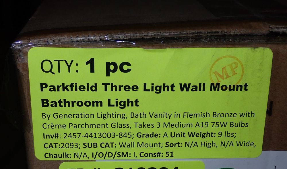 Parkfield Three Light Wall Mount Bathroom Light. By Generation Lighting, Bath Vanity in Flemish Bronze with Crème Parchment Glass, Takes 3 Medium A19 75W Bulbs, Grade: A,This is a liquidated product. Any pre-existing retail, wholesale or manufacturer warranties will not transfer with the sale of this Product unless expressly stated otherwise. Weight: 9. Sold by: Piece. Sold as: Quantity X Price. Inventory #: 2457-4413003-845