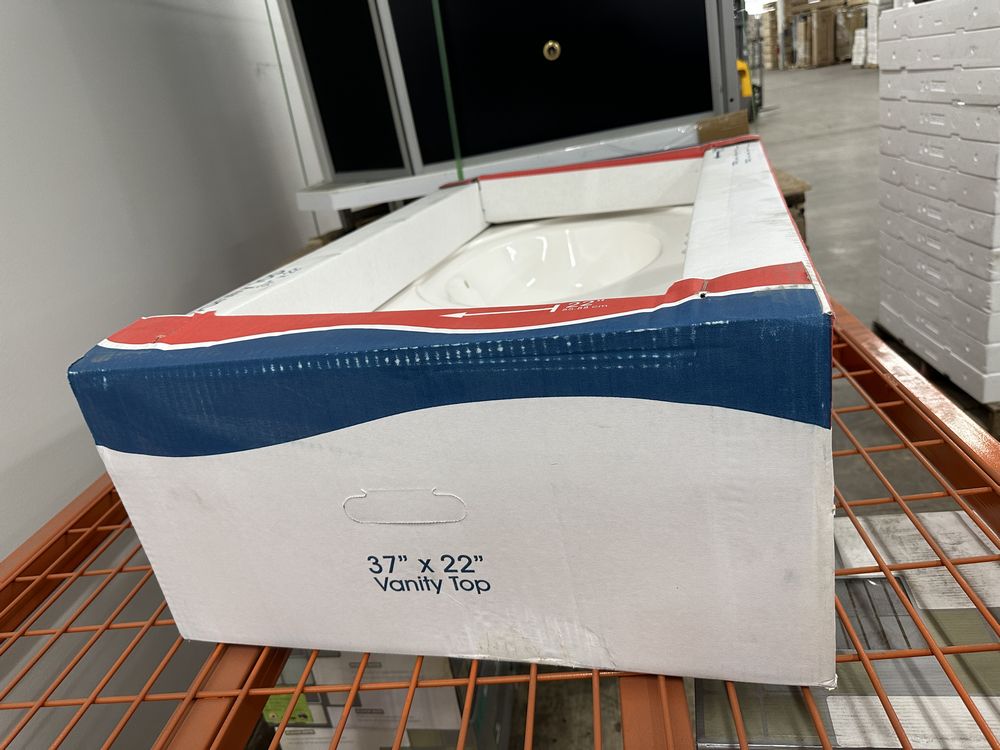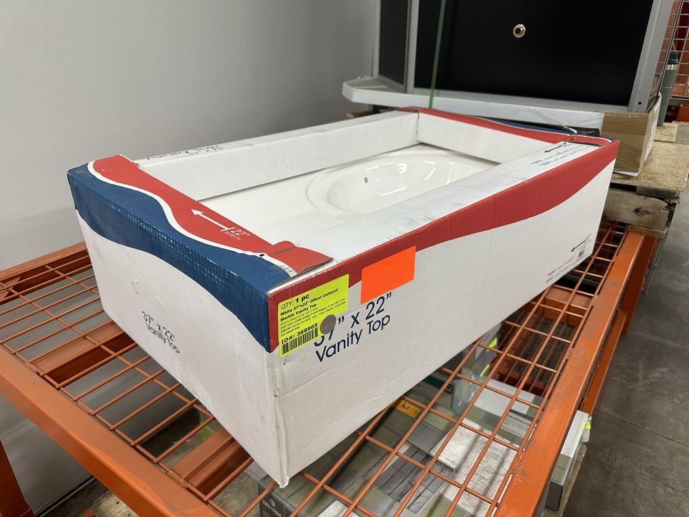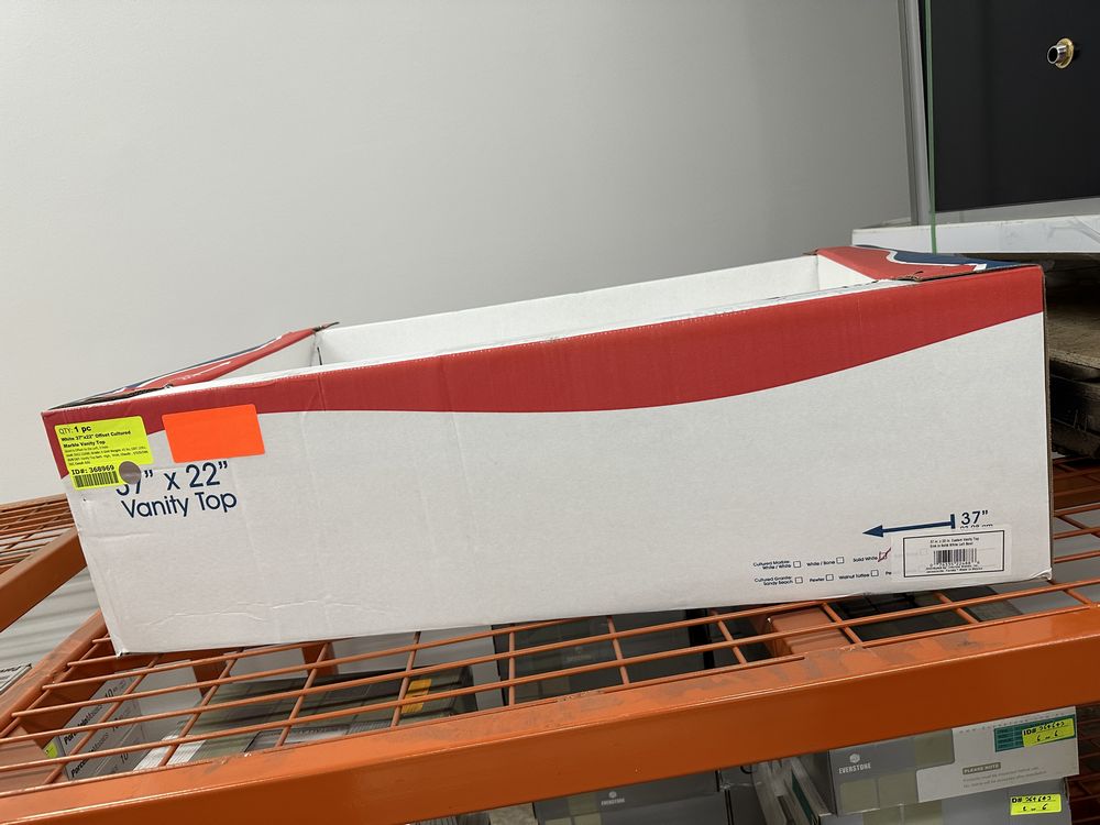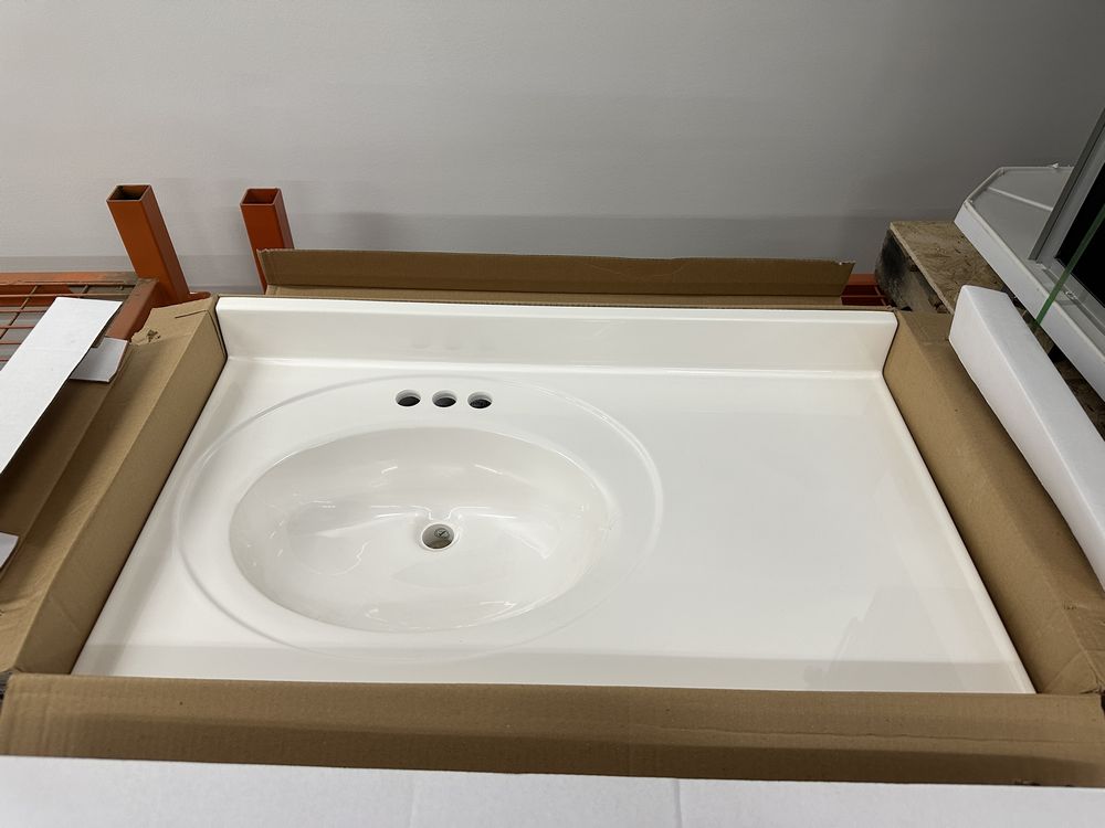 White 37"x22" Offset Cultered Marble Vanity Top. Bowl is Offset to the Left, 3 Hole, Grade: A,This is a liquidated product. Any pre-existing retail, wholesale or manufacturer warranties will not transfer with the sale of this Product unless expressly stated otherwise. Weight: 45. Sold by: Piece. Sold as: Quantity X Price. Inventory #: 5022-22488