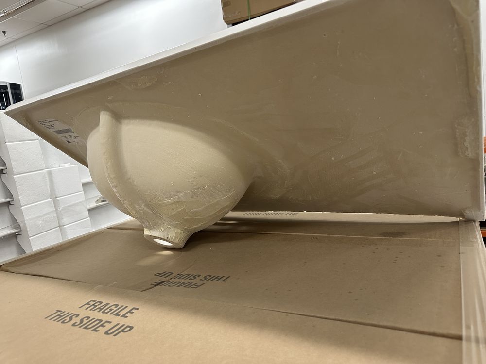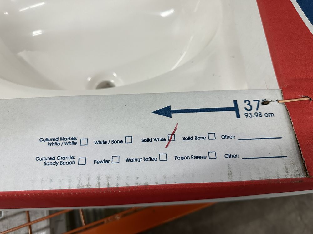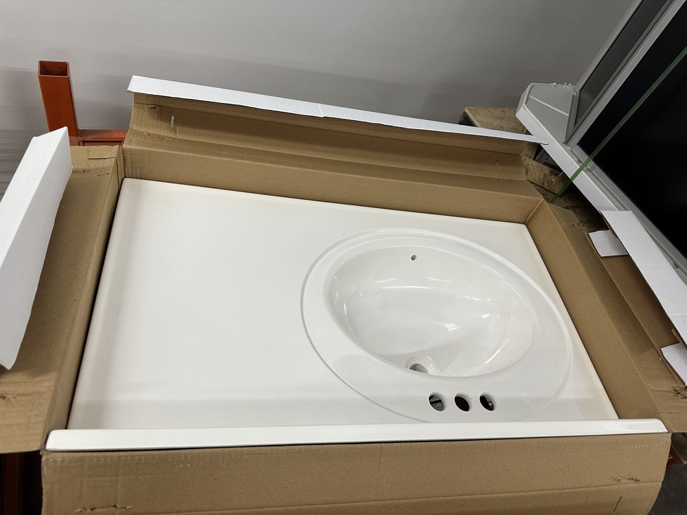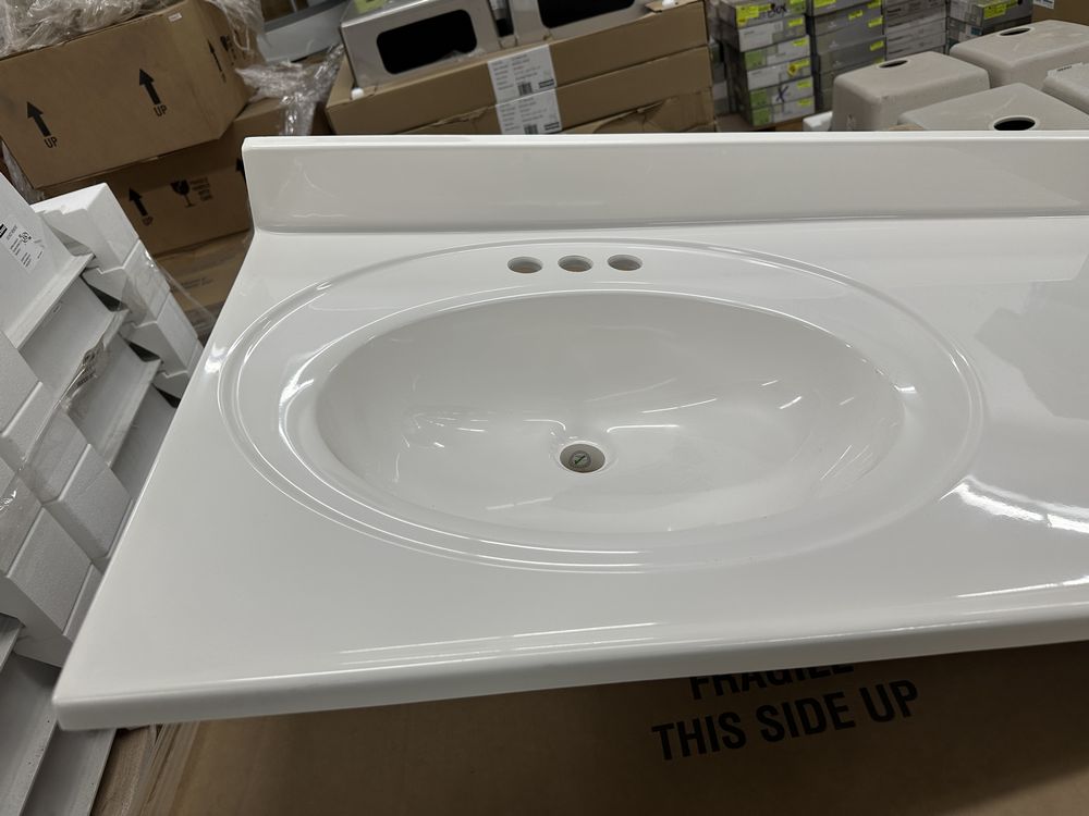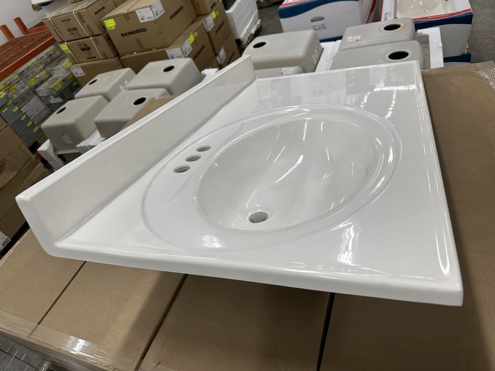 White 37"x22" Offset Cultered Marble Vanity Top. Bowl is Offset to the Left, 3 Hole, Grade: A,This is a liquidated product. Any pre-existing retail, wholesale or manufacturer warranties will not transfer with the sale of this Product unless expressly stated otherwise. Weight: 45. Sold by: Piece. Sold as: Quantity X Price. Inventory #: 5022-22488
