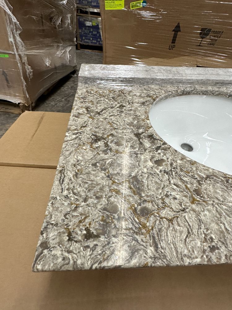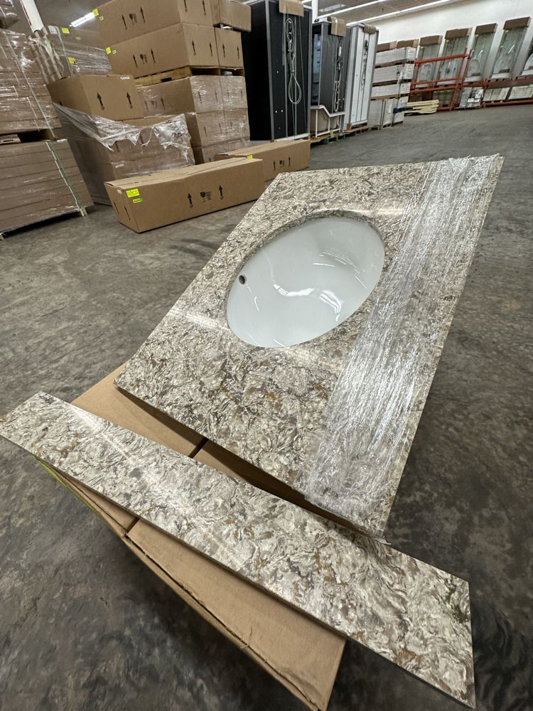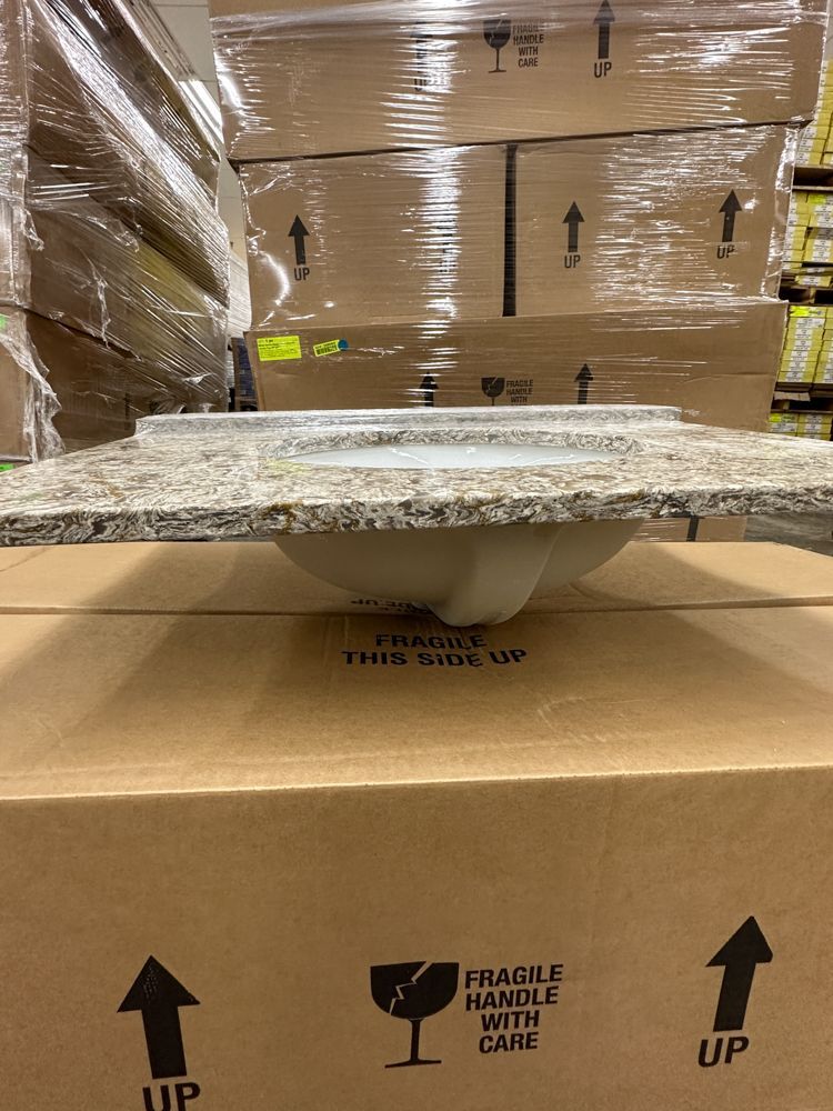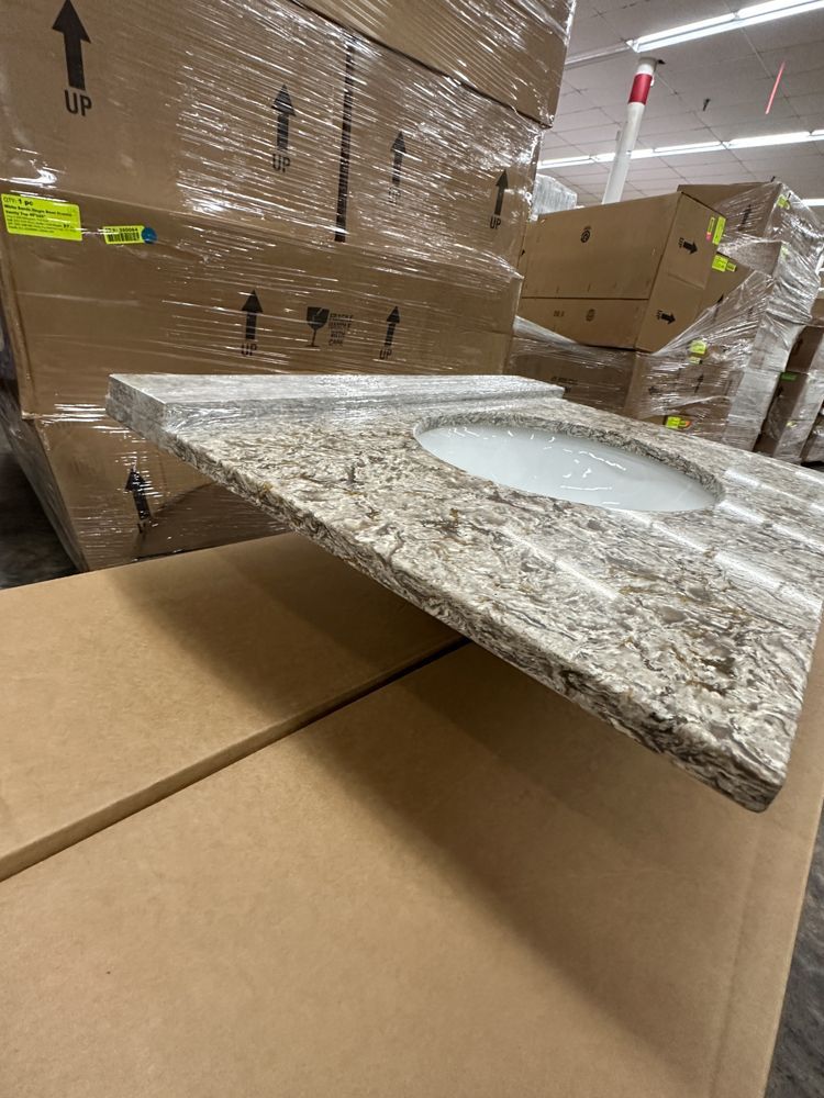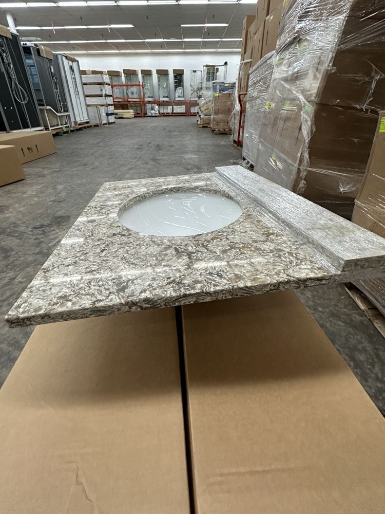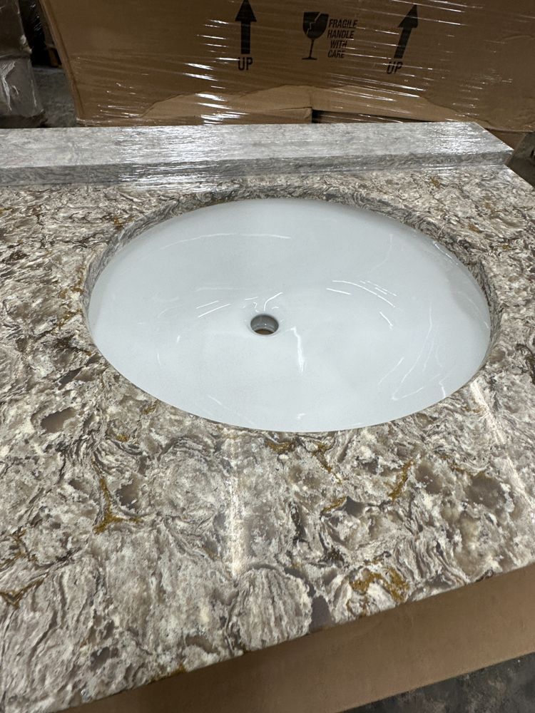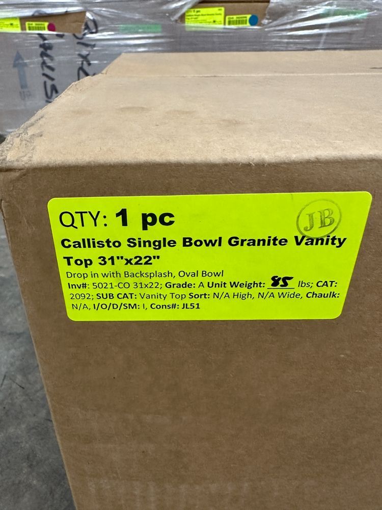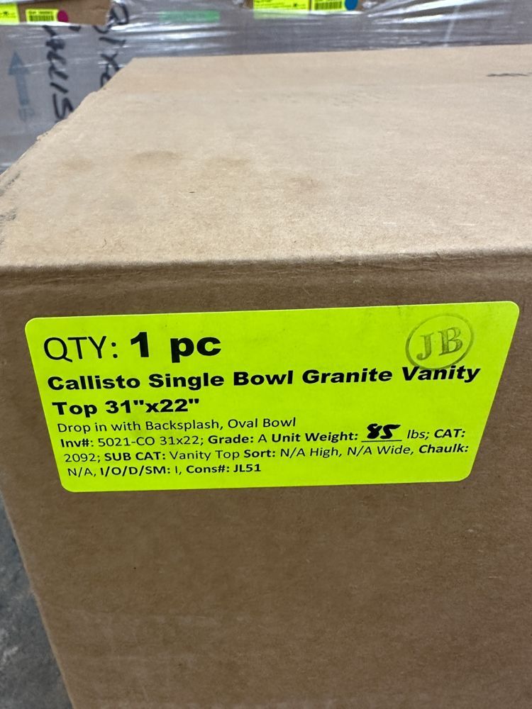 Callisto Single Bowl Granite Vanity Top 31"x22". Drop In With Backsplash, Oval Bowl, Grade: A,This is a liquidated product. Any pre-existing retail, wholesale or manufacturer warranties will not transfer with the sale of this Product unless expressly stated otherwise. Weight: 85. Sold by: Piece. Sold as: Quantity X Price. Inventory #: 5021-CO 31x22