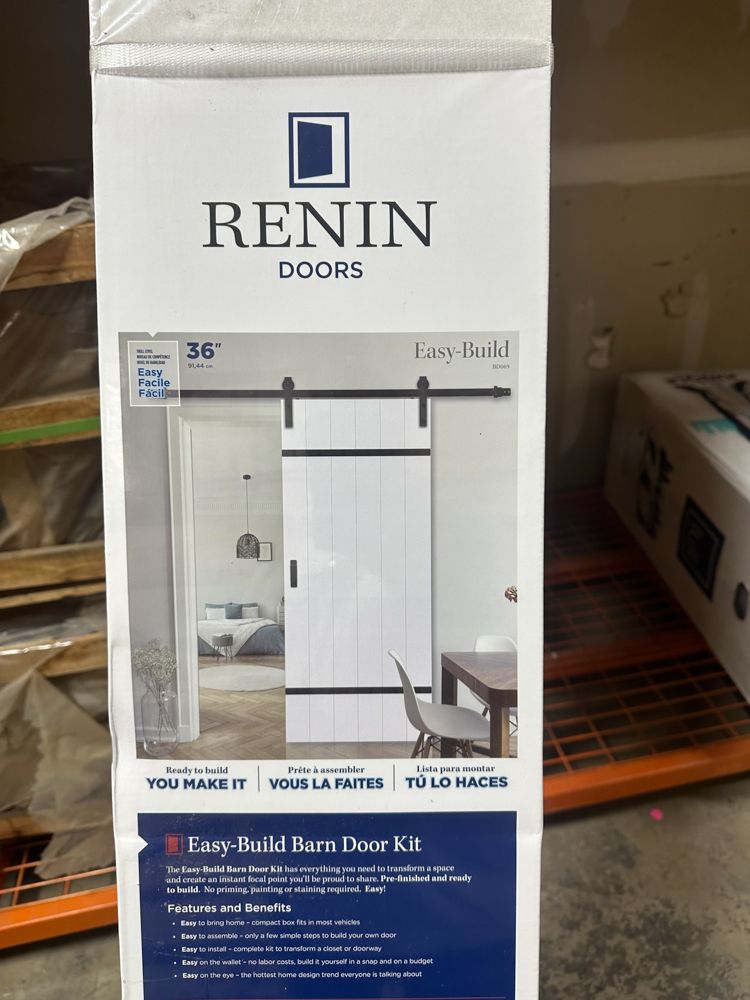 Barn Door Kit With Hardware, Bright White Door With Black Hardware, Door Size 36"x84". By Renin, Engineered Wood Planks, Bent Strap, Track, Handle, Assembly And Hanging Hardware Fits Openings 28"-34"x80.5" Grade: New,This is a liquidated product. The Auction Company makes no express or implied representations or warranties of any kind regarding the Product. Any pre-existing retail, wholesale or manufacturer warranties will not transfer with the sale of this Product unless expressly stated otherwise on this page. The Buyer accepts the Product in as-is condition, with all faults. Weight: 106. Sold by: Door. Sold as: Quantity X Price. Inventory #: 5226-BD069