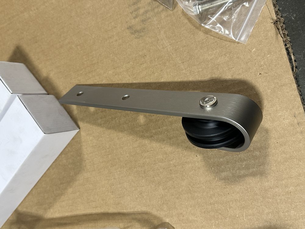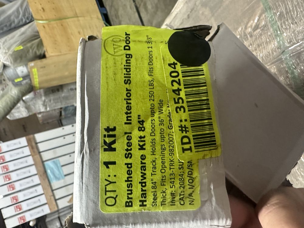 Brushed Steel Interior Sliding Door Hardware Kit 84". Steel 84" Track, Holds Door upto 250 LBS, Fits Door 1 3/8" Thick, Fits Openings upto 36" Wide This is a liquidated product. The Auction Company makes no express or implied representations or warranties of any kind regarding the Product. Any pre-existing retail, wholesale or manufacturer warranties will not transfer with the sale of this Product unless expressly stated otherwise on this page. The Buyer accepts the Product in as-is condition, with all faults. Weight: 20 lbs. Sold by: Kit. Sold as: Quantity X Price. Inventory #: 5413-TRK-982007