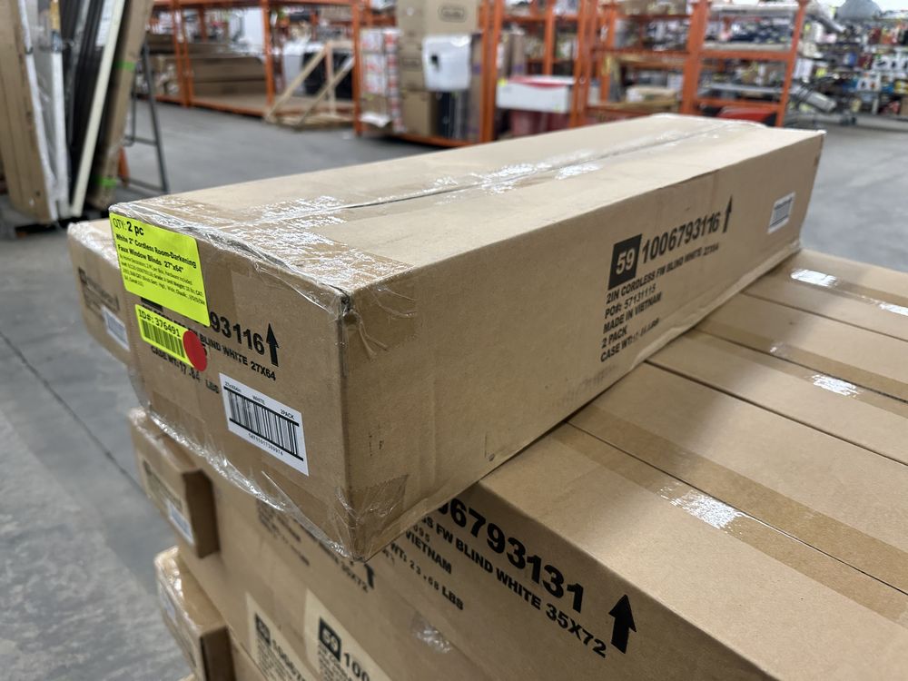 White 2" Cordless Room-Darkening Faux Window Blinds 27"x64". By Home Decorators, 2PC per Box, Hardware included. Grade A,This is a liquidated product. Any pre-existing retail, wholesale or manufacturer warranties will not transfer with the sale of this Product unless expressly stated otherwise. Weight: 18lbs. Sold by: Piece. Sold as: Quantity X Price. Inventory #: 61120-1006793116