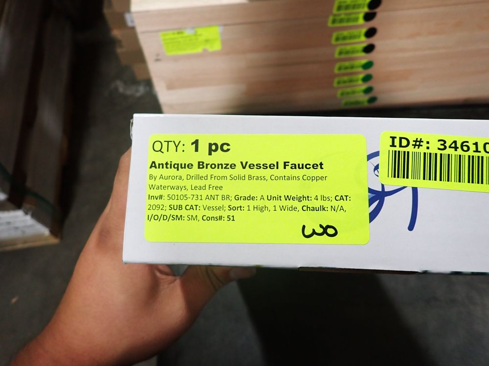 Antique Bronze Vessel Faucet. By Aurora, Drilled From Solid Brass, Contains Copper Waterways, Lead Free, Grade: A,This is a liquidated product. Any pre-existing retail, wholesale or manufacturer warranties will not transfer with the sale of this Product unless expressly stated otherwise. Weight: 4. Sold by: Piece. Sold as: Quantity X Price. Inventory #: 50105-731 ANT BR
