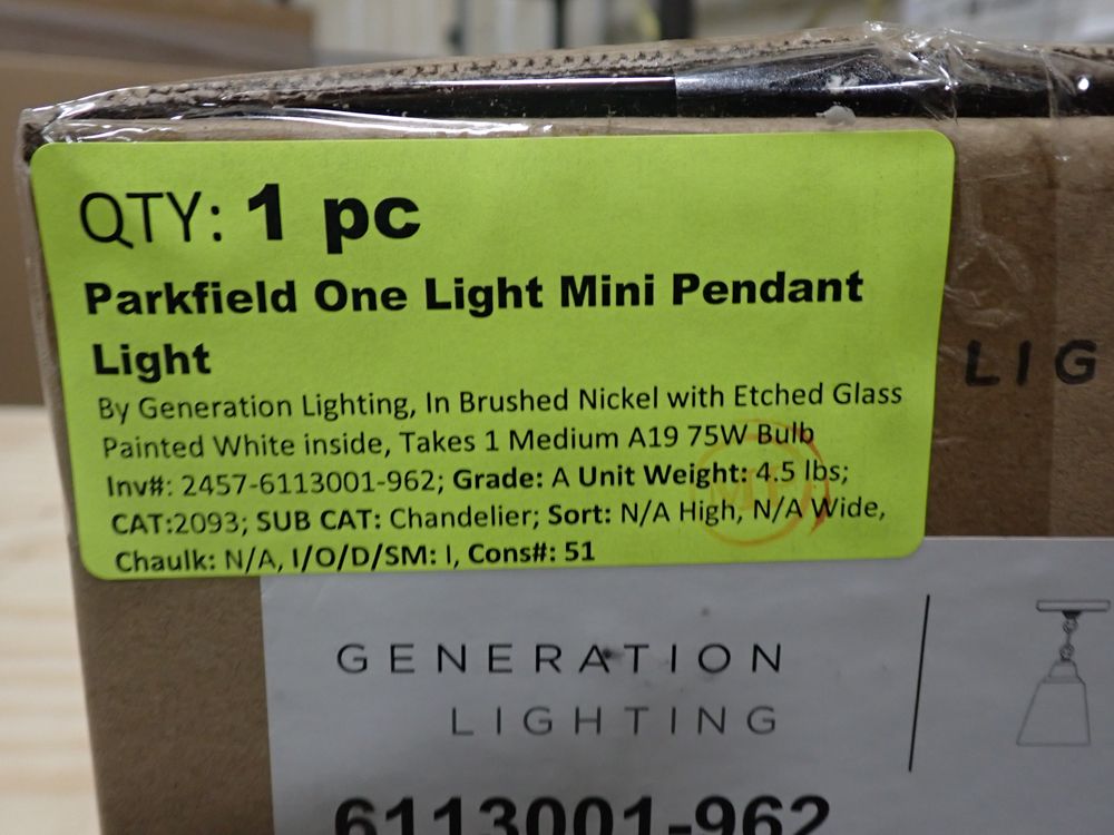 Parkfield One Light Mini Pendant Light. By Generation Lighting, In Brushed Nickel With Etched Glass Painted White Inside, Takes 1 Medium A19 75W Blub, Grade: A,This is a liquidated product. Any pre-existing retail, wholesale or manufacturer warranties will not transfer with the sale of this Product unless expressly stated otherwise. Weight: 4.5. Sold by: Piece . Sold as: Quantity X Price. Inventory #: 2457-6113001-962