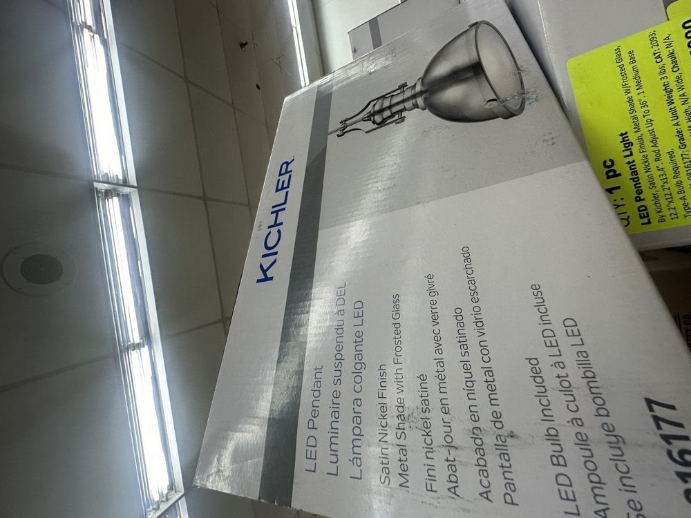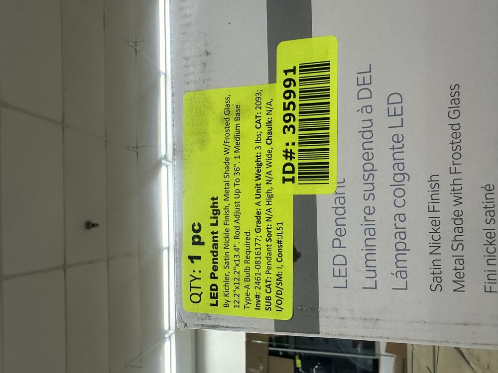 LED Pendant Light. By Kichler, Satin Nickel Finish, Metal Shade w/ Frosted Glass, 12.2"x12.2"x13.4", Rod adjust up to 36", 1 Medium Base Type-A Bulb Required, Grade: A,This is a liquidated product. Any pre-existing retail, wholesale or manufacturer warranties will not transfer with the sale of this Product unless expressly stated otherwise. Weight: 3. Sold by: Piece. Sold as: Quantity X Price. Inventory #: 2461-0816177
