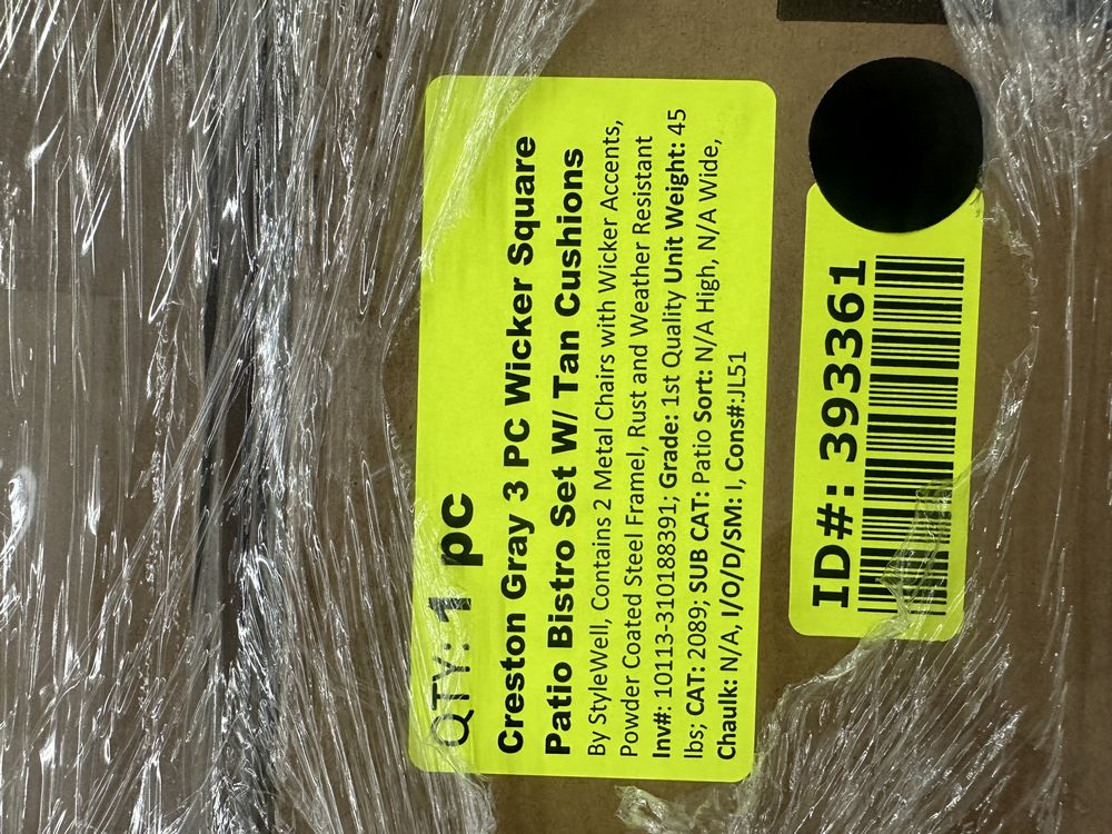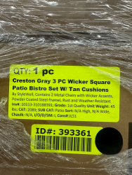 Creston Gray 3 Piece Wicker Square Patio Bistro Set With Tan Cushions. By StyleWell, Contains 2 Metal Chairs with Wicker Accents, Powder Coated Steel Frame, Rust and Weather Resistant, Grade: 1st Quality,This is a liquidated product. Any pre-existing retail, wholesale or manufacturer warranties will not transfer with the sale of this Product unless expressly stated otherwise. Weight: 45. Sold by: Piece. Sold as: Quantity X Price. Inventory #: 10113-310188391