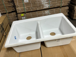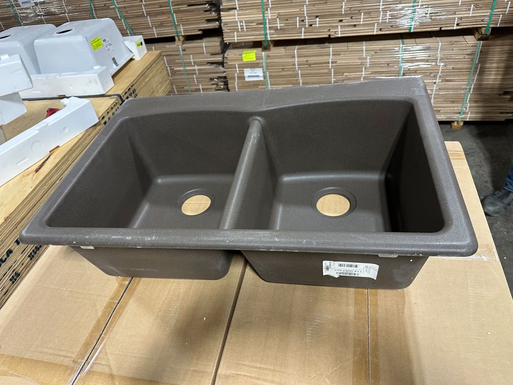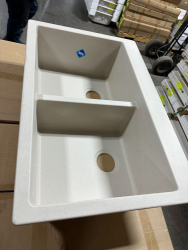 Granite Champagne Double Bowl Sink 33"x22"x8 1/2". By Franke, Rough Opening Dimensions 17 1/8"x14 3/"x8 1/2" for both bowls, Includes Bit for Faucet Holes, Grade: New. REID: 368795 This is a liquidated product. Any pre-existing retail, wholesale or manufacturer warranties will not transfer with the sale of this Product unless expressly stated otherwise. Weight: 35lbs. Sold by: Piece. Sold as: Quantity X Price. Inventory #: 5016-591