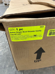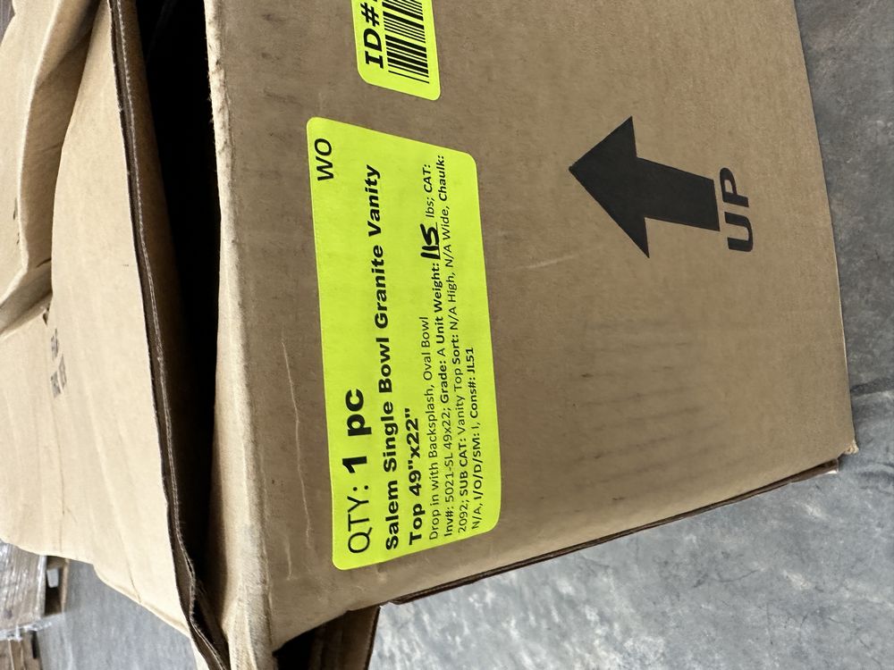 Salem Single Bowl Granite Vanity Top 49"x22". Drop in with Backsplash, Oval Bowl. Grade: A. This is a liquidated product. Any pre-existing retail, wholesale or manufacturer warranties will not transfer with the sale of this Product unless expressly stated otherwise. Weight: 115. Sold by: Piece. Sold as: Quantity X Price. Inventory #: 5021-SL 49x22