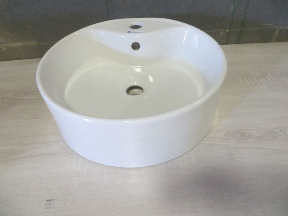White Lavatory Piazza Vessel Sink. By Premier, Round Front, Single Faucet Hole, 16 3/4" Diameter, 5 3/4" Height, Grade: A. This is a liquidated product. Any pre-existing retail, wholesale or manufacturer warranties will not transfer with the sale of this Product unless expressly stated otherwise. Weight: 23 lbs.. Sold by: Piece. Sold as: Quantity X Price. Inventory #: 5055-PIAZ SNK